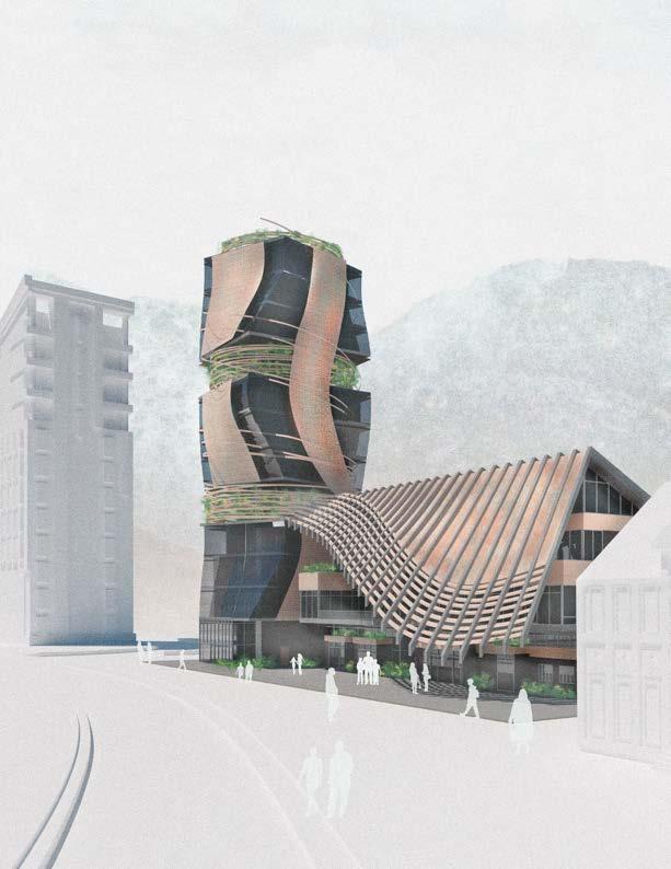The Foothills Textile School is designed to resemble the textile process from start to finish with an emphasis on the history of the textile industry in the Southeast. Students at this campus would primarily focus their studies on a textile fabrication technique that was used before the Industrial Revolution. The spiral of the residential tower and the woven facade of the school suggests the weaving movement of individuals coming together to practice the artistry of textile production. The threads of this project are the residents, copper, and landscape that intertwine to create a community-based learning environment.