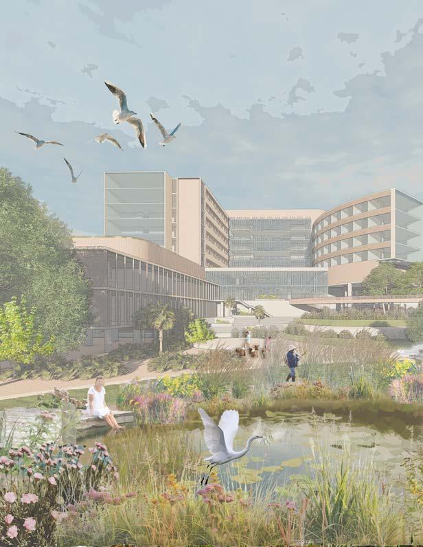 The proposed campus plan is a resilient, sustainable design that tackles rising sea levels, stormwater management, and equitable green space access. The hospital incorporates strategies for energy efficiency, water conservation, material selection, and ecosystem preservation, with a focus on supporting marsh migration to safeguard Charleston’s coastal environment. Reflecting the city’s strong connection to water, the design enhances the healing experience for patients, staff, and visitors, offering both aesthetic value and psychological comfort to alleviate the stresses common in healthcare settings.