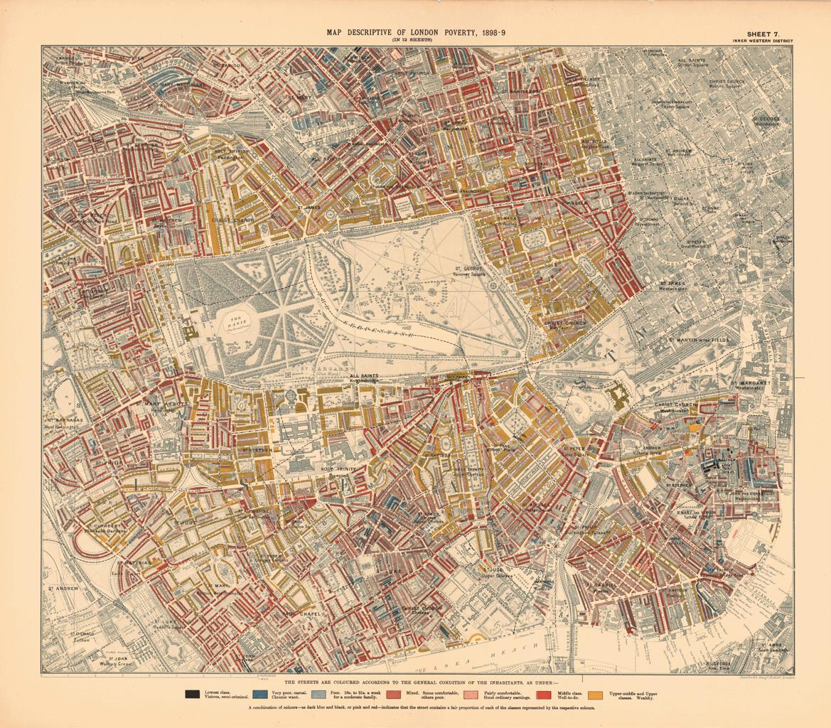 Charles Booth’s Poverty Maps of the 1880s show a clear division in Knightsbridge between the bourgeois middle class southeast (red/pink), and extraordinary affluence of its northwest (yellow), and developers such as Lord Listowel were hell-bent on maintaining the exclusivity of his aristocratic enclave of vast townhouses of unsurpassed luxury, encompassing Ennismore Gardens and Rutland Gate. There were to be no north-south access roads, with Listowel’s development effectively quarantined by way of a curtain wall impenetrable to either coach and horse or pedestrians; and so it remained for a century… until Hitler’s bombs fell.