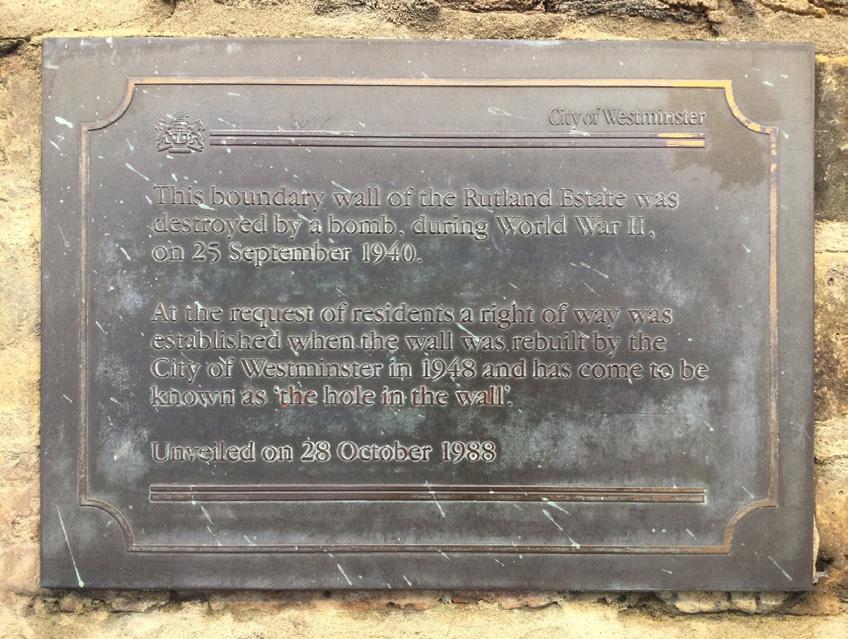 25 September 1940. But so was the wall that had preserved the ghetto of northwest Knightsbridge, the breach very conveniently allowing access between Rutland Mews East and its adjacent Rutland Street. Clambering over the rubble, residents of the former could now pop to the shops of Brompton Road in a fraction of the time, and so popular was this pedestrian ‘rat run’ that a neat portico with steps was constructed, known as…’the hole in the wall’. An unintended consequence of the Blitz.