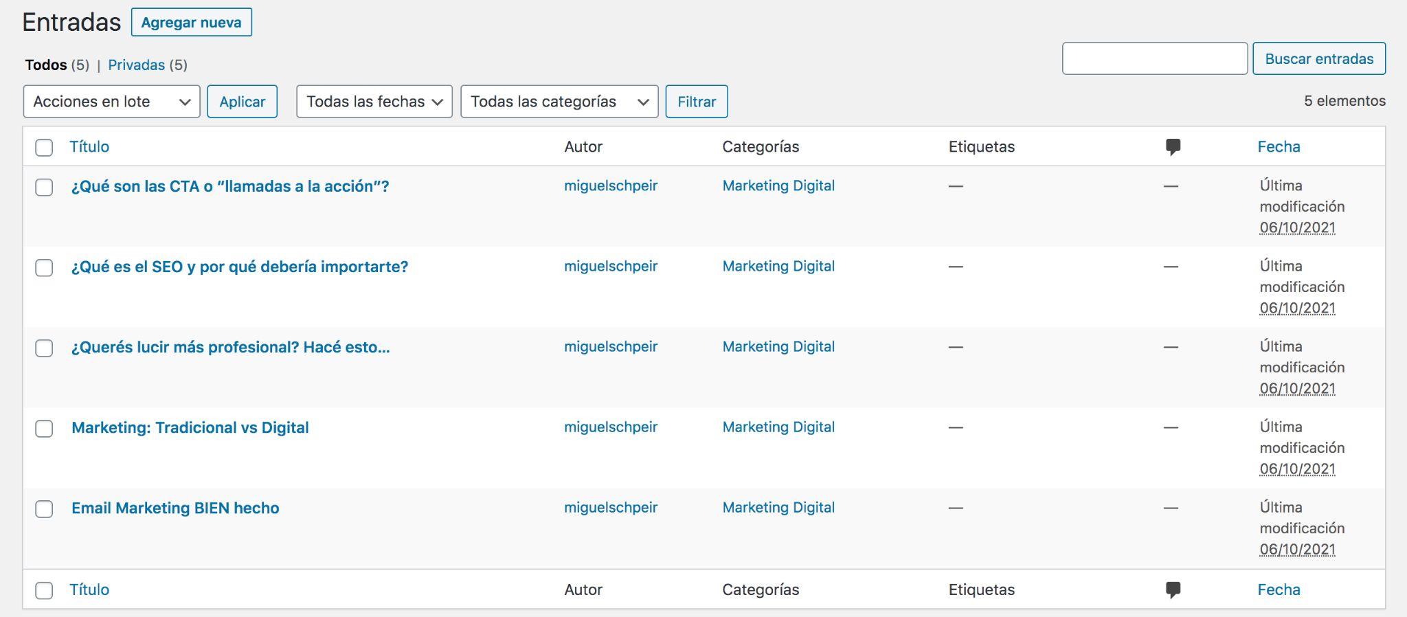 Se crean entradas dentro de la categoría "Marketing Digital". Luego se aplicarán las etiquetas (tags). Las entradas contienen links internos y externos así como también