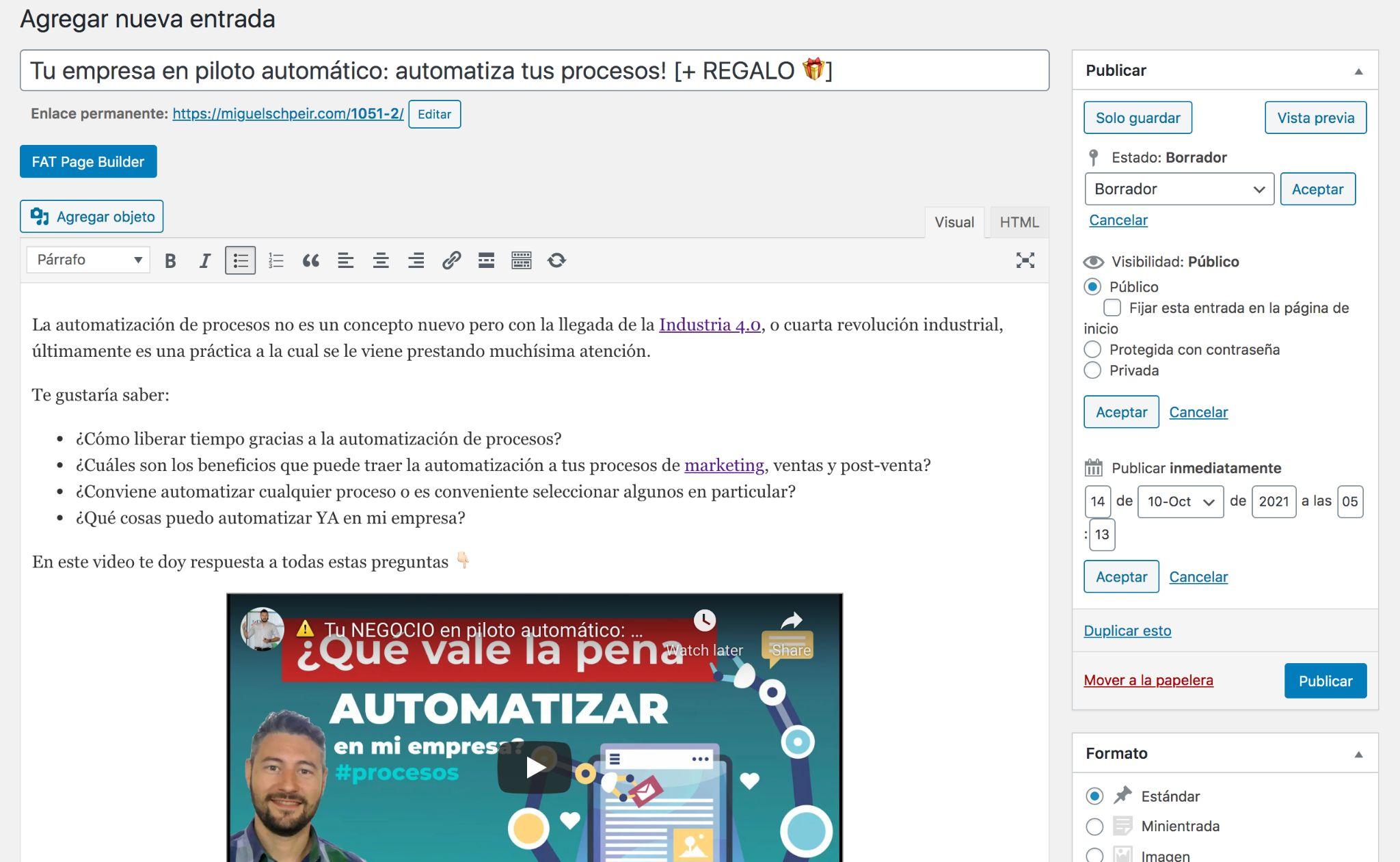 Se programó la publicación de una entrada. Además puede verse que el post tiene links externos (Industria 4.0), internos (enlace a otro posteo sobre definición de "Marketing") y también un video de YouTube. Debajo del video se da la CTA de suscribirse al canal.