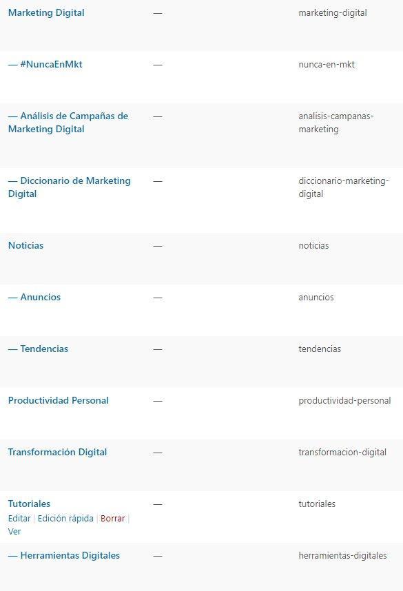 En esta captura se pueden apreciar todas las categorías (correspondientes al sitemap del blog), sus dependencias (categorías superiores) y también el correspondiente slug (URL amigable) de cada una de ellas.