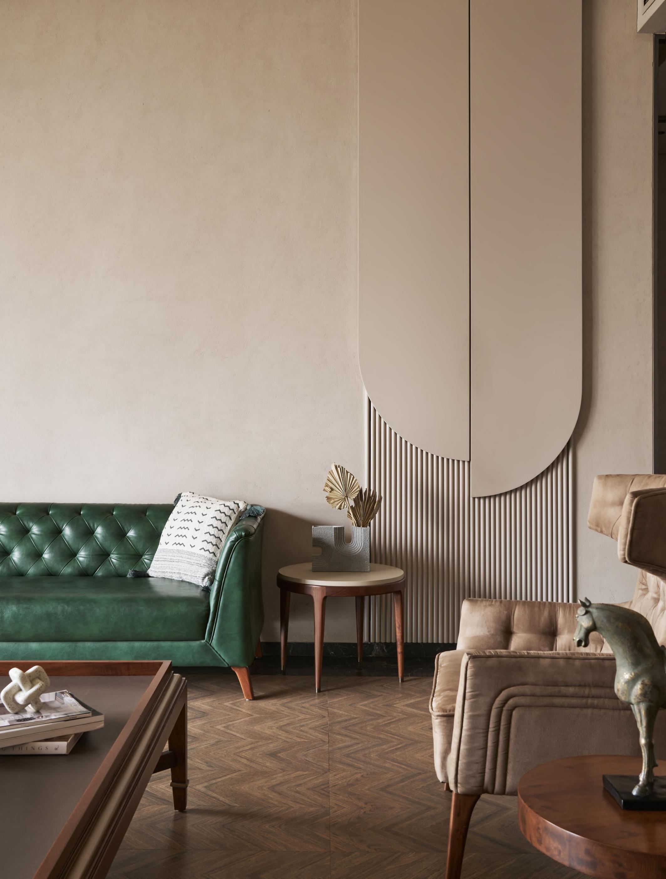 The living room extends this sculptural language through a refined layering of materials and forms. A deep green tufted sofa anchors the space in plush sophistication, while paired