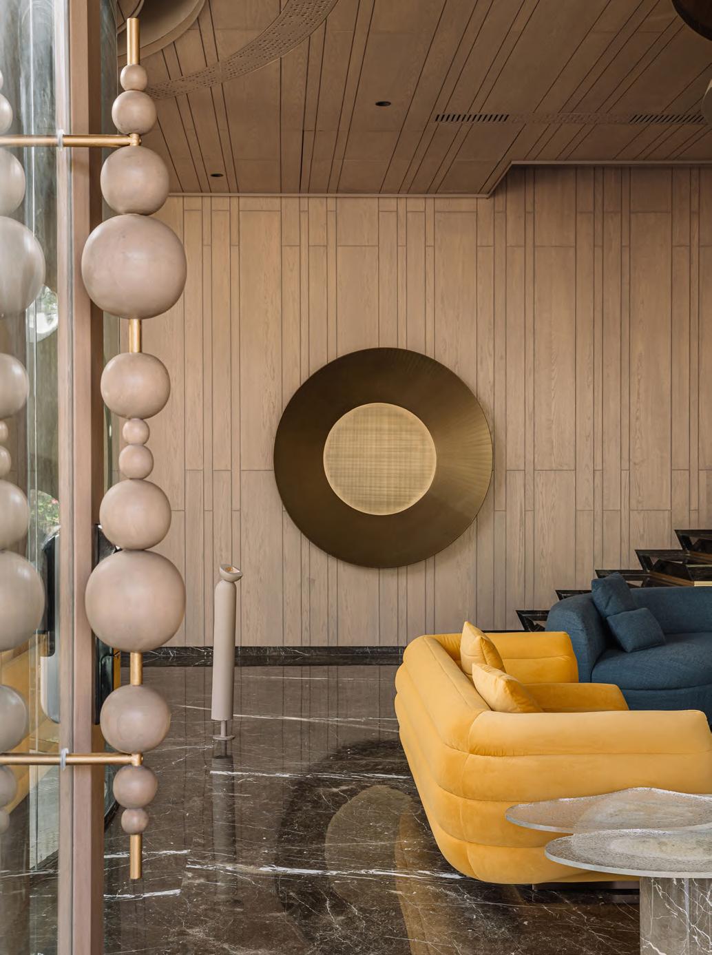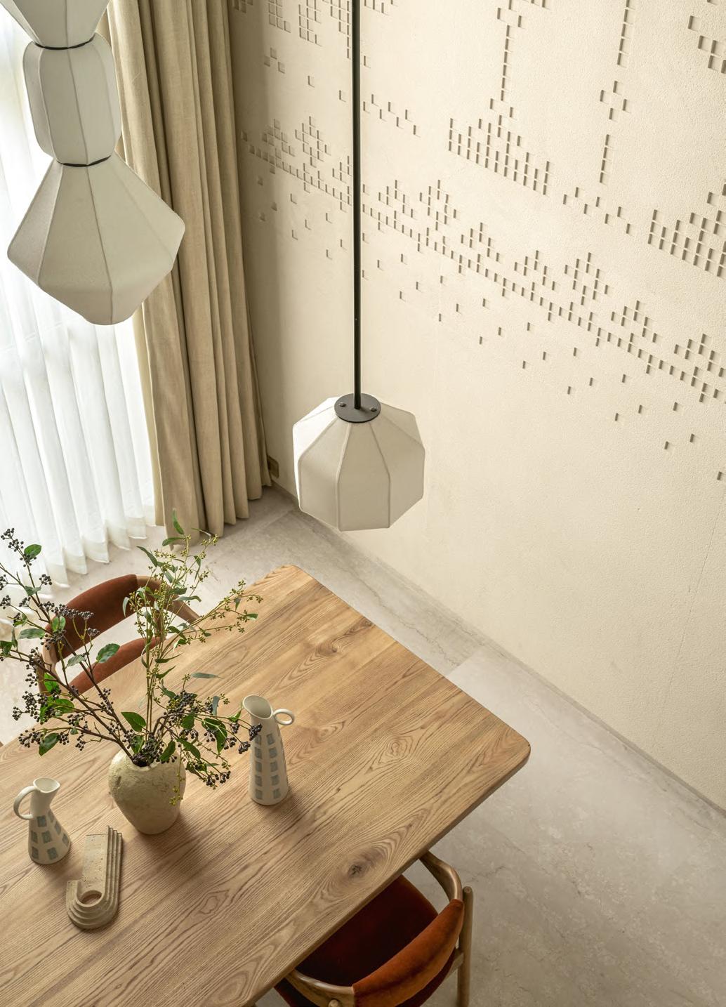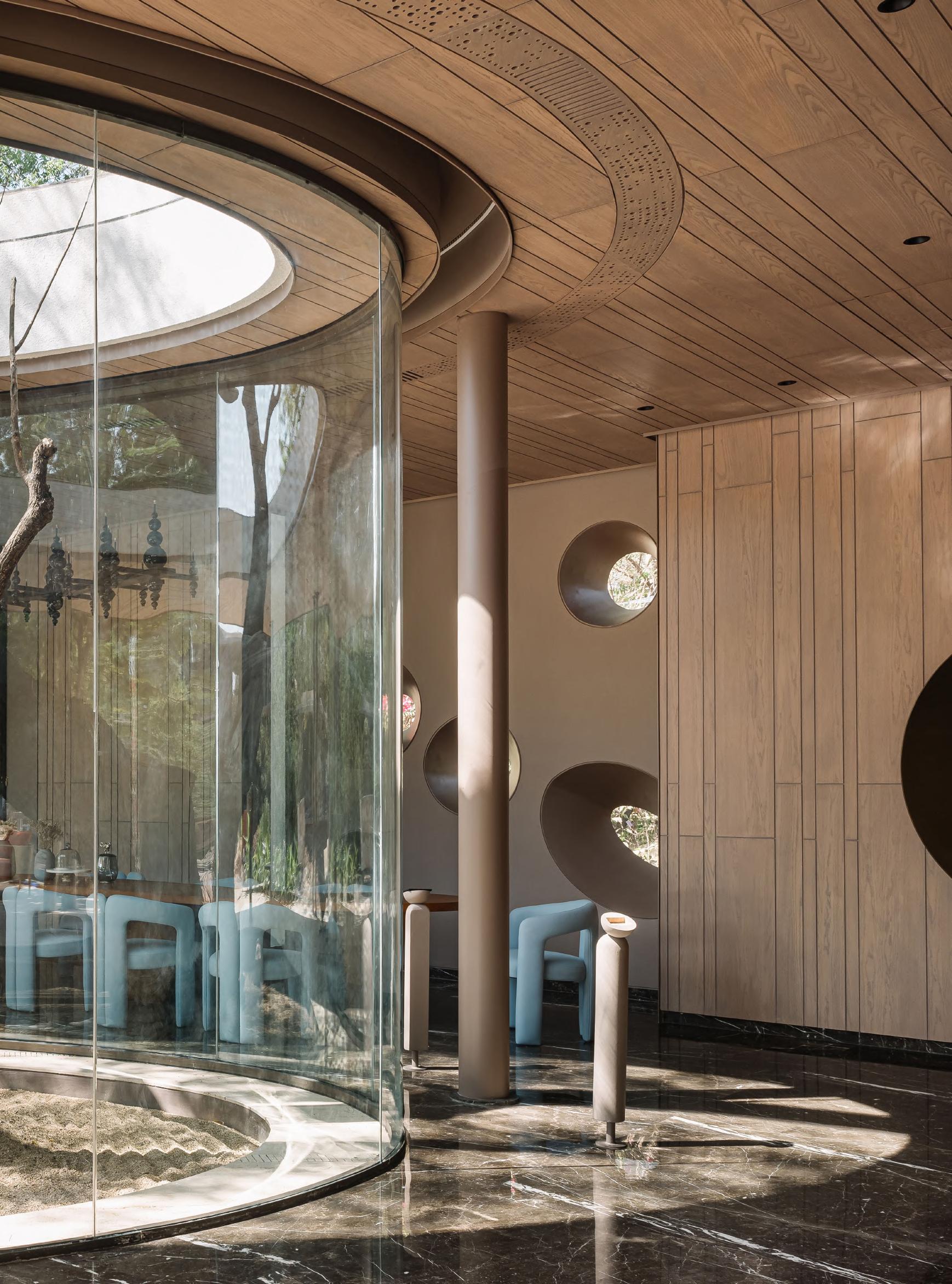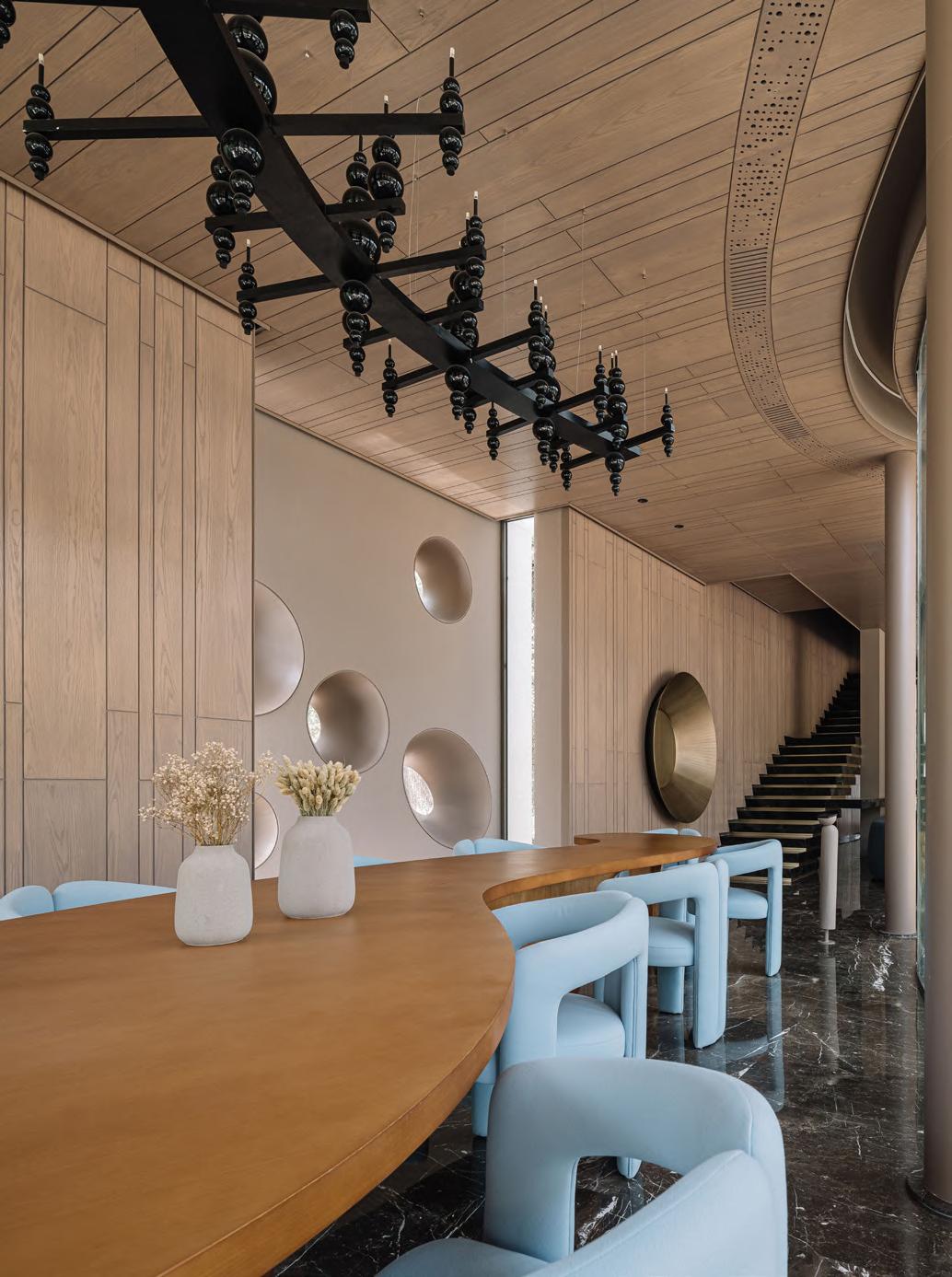 The dining space epitomises this ethos. Fluid curvatures shape the room, tactile wood softens the crisp geometry, and dramatic lighting acts as a sculptural punctuation. Circular motifs introduce playfulness, creating a tableau built for conversation, reflection, and shared culinary rituals. The space feels intimate yet atmospheric, contemporary yet timeless.