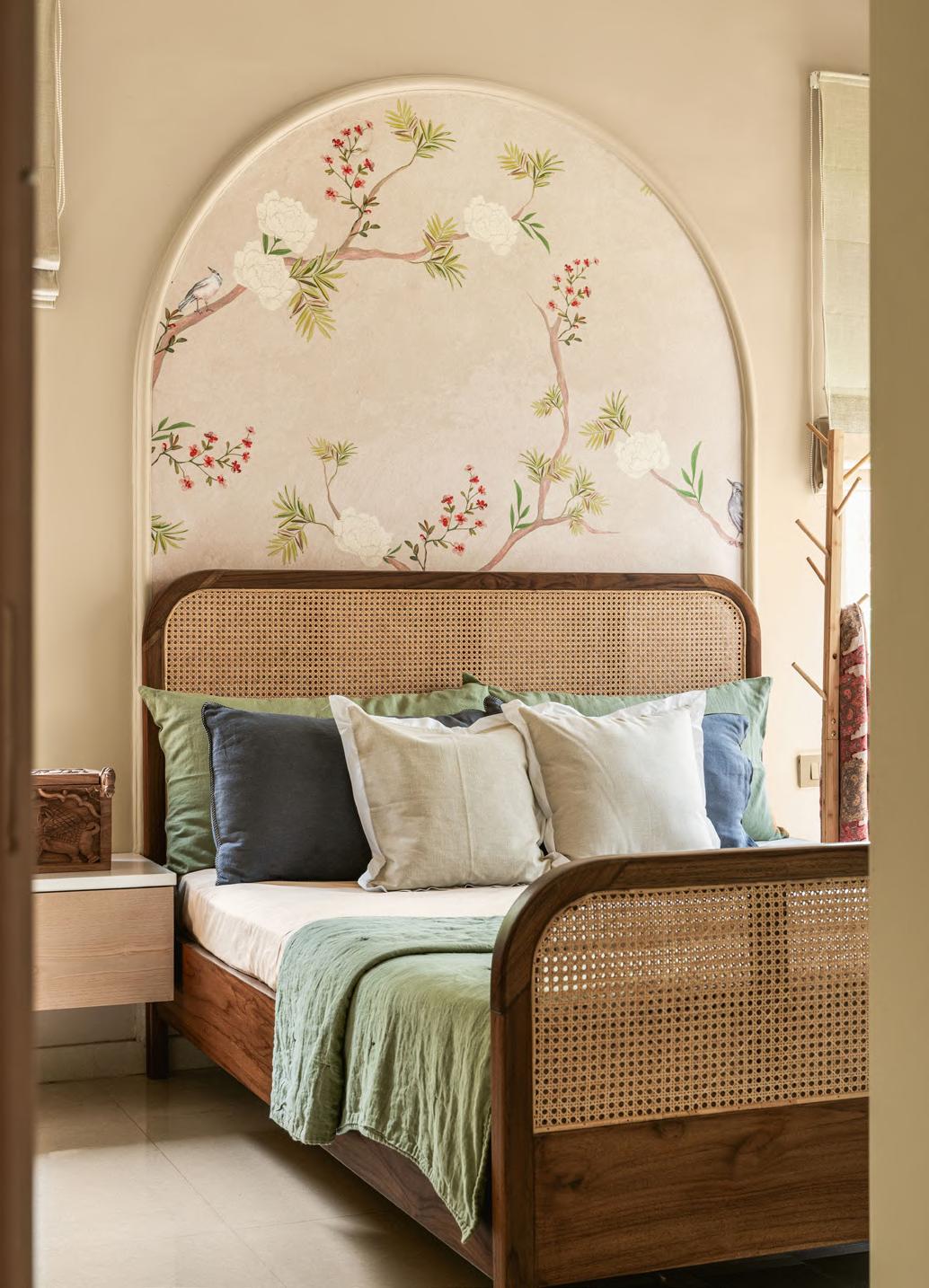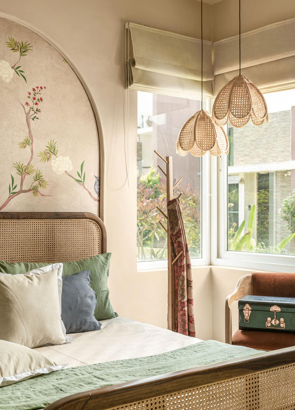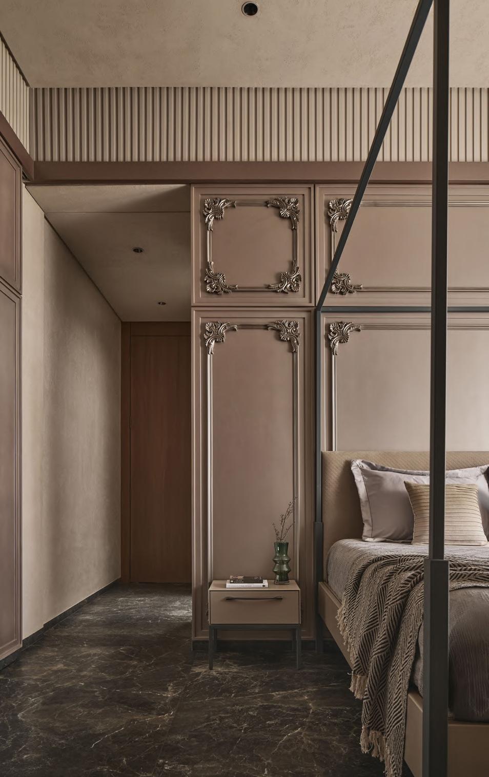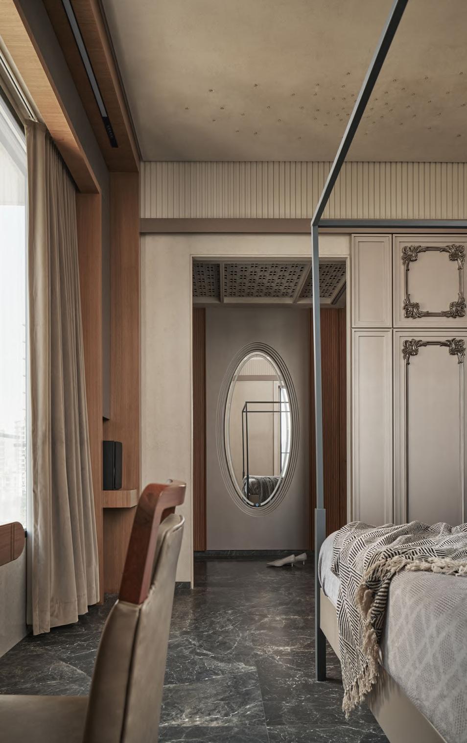 The master bedroom is serene and contemplative, defined by soft fabric tones, clean-lined furniture, and a sculptural circular wall art piece that serves as a gentle focal point. Another bedroom features a hand-carved wooden panel depicting two cranes beneath a tree, framed by dark fluted partitions — a poetic ode to craftsmanship and storytelling. The third bedroom leans into classical charm with a four-poster bed and refined mouldings reminiscent of a European boutique suite.