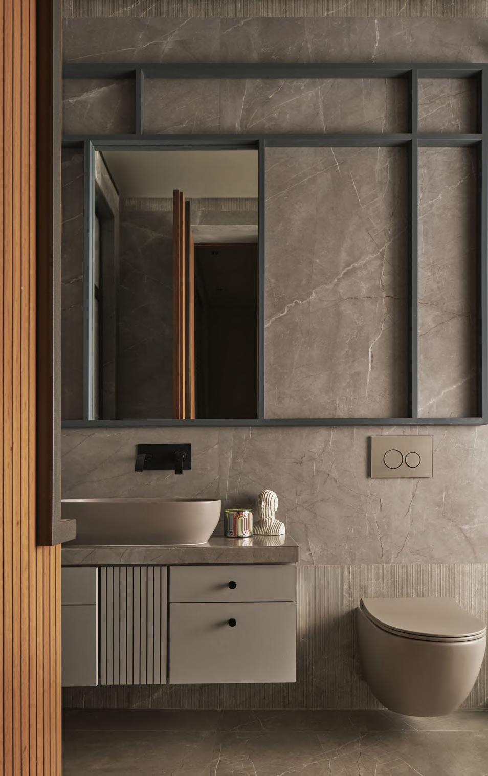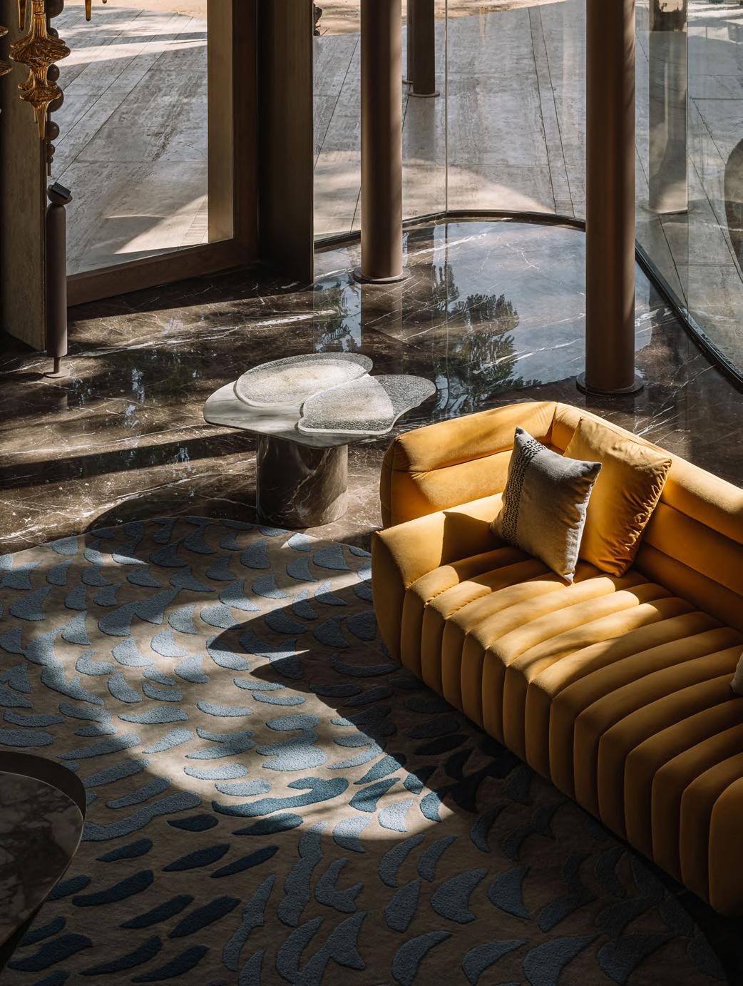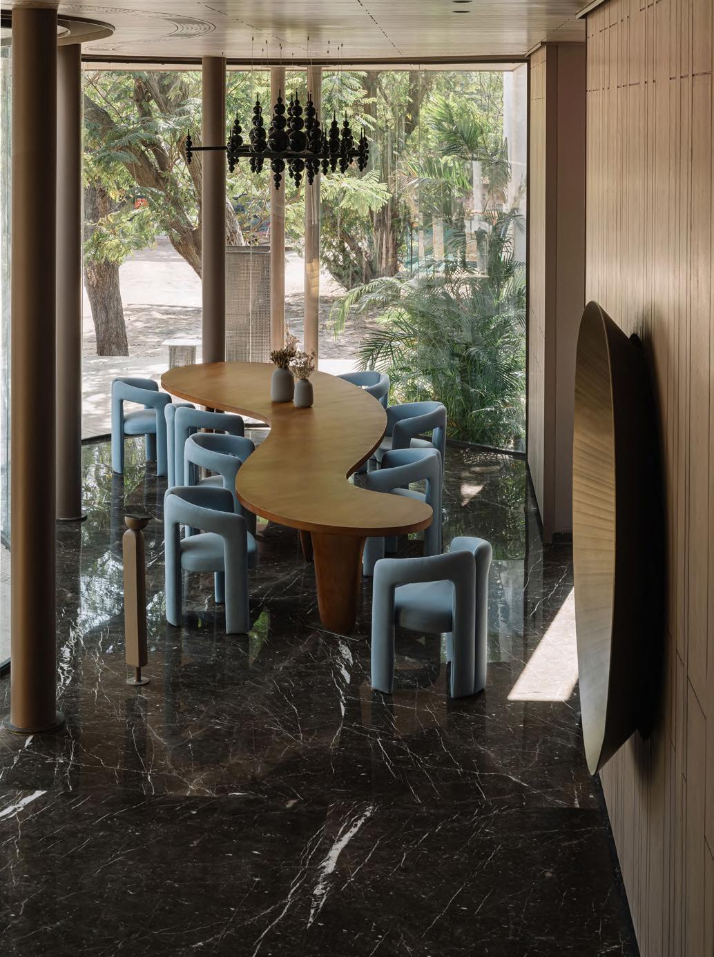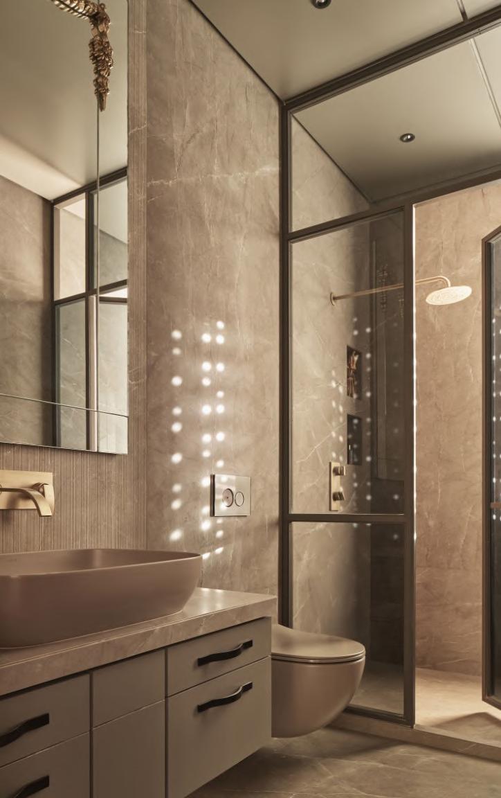 The palette resonates with the project’s contextual dialogue: earthen tones meet polished marble, timber blends with glass, and metallic moments introduce subtle brilliance. Each material is chosen not merely for its appearance but for its sensorial contribution—texture, warmth, reflectivity, depth.