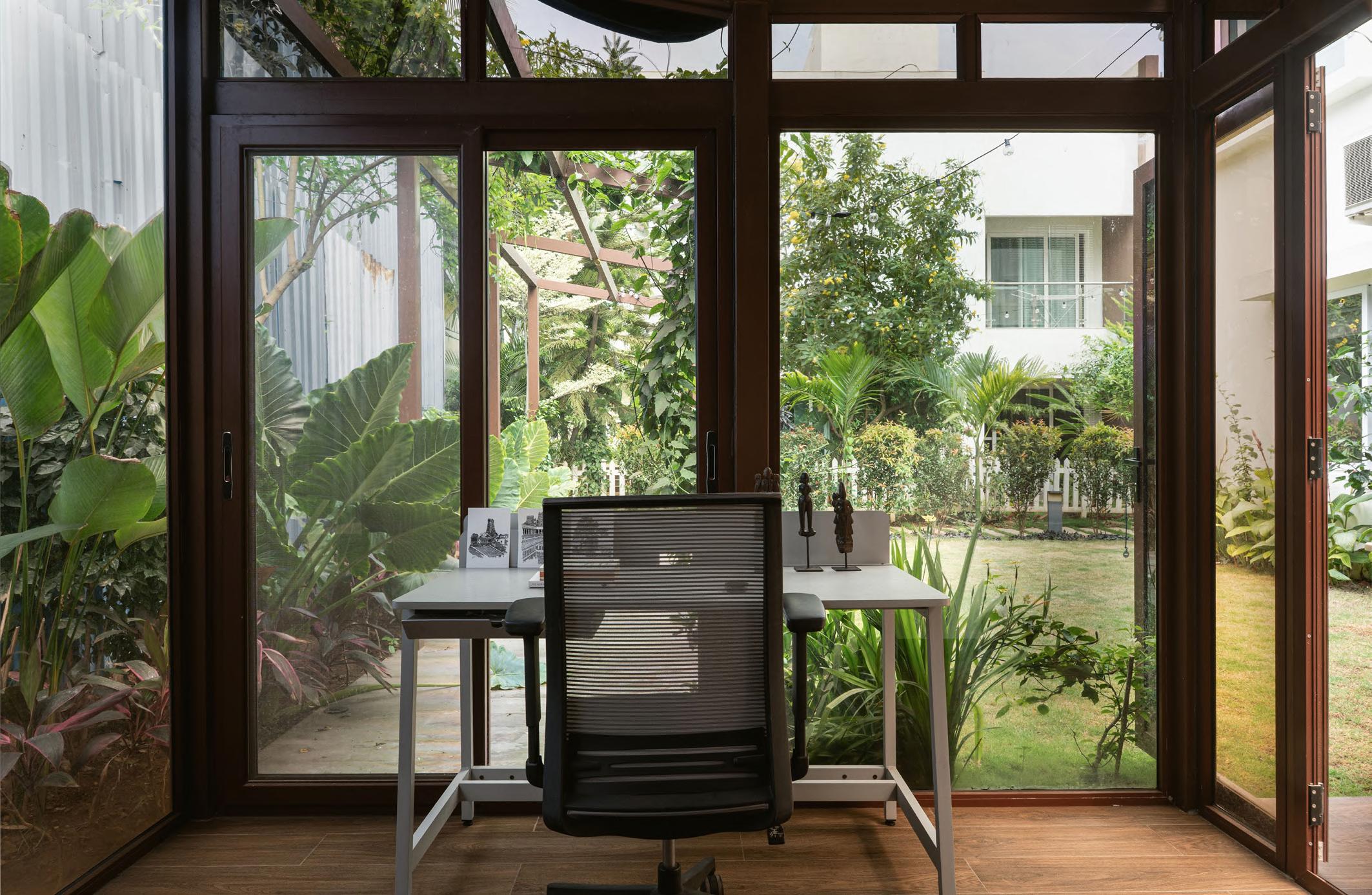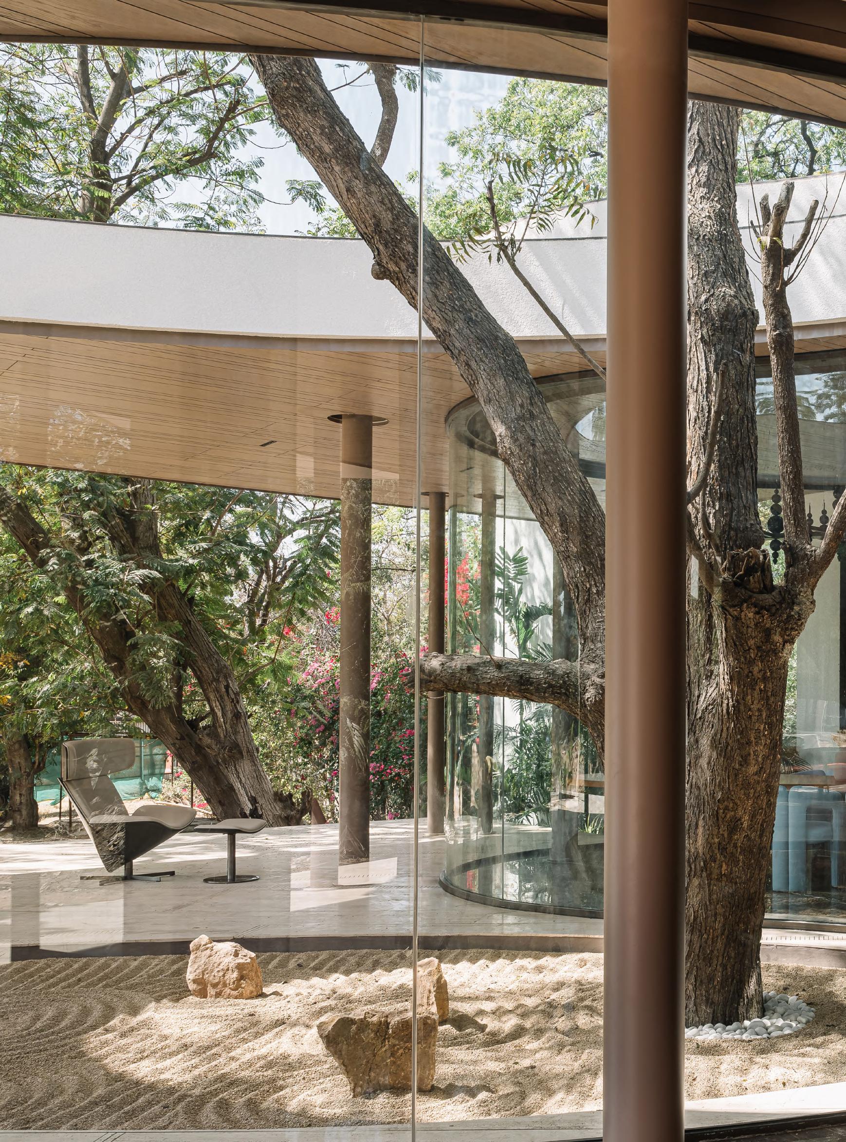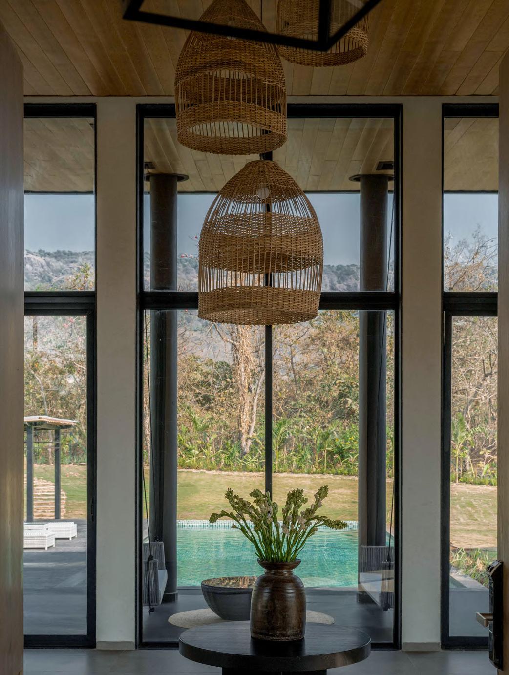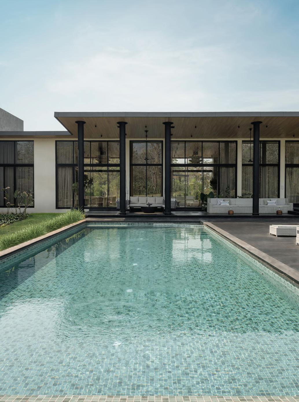 frame sweeping views of the garden and swimming pool, allowing natural light to pour through the interiors while maintaining an uninterrupted dialogue with the outdoors.