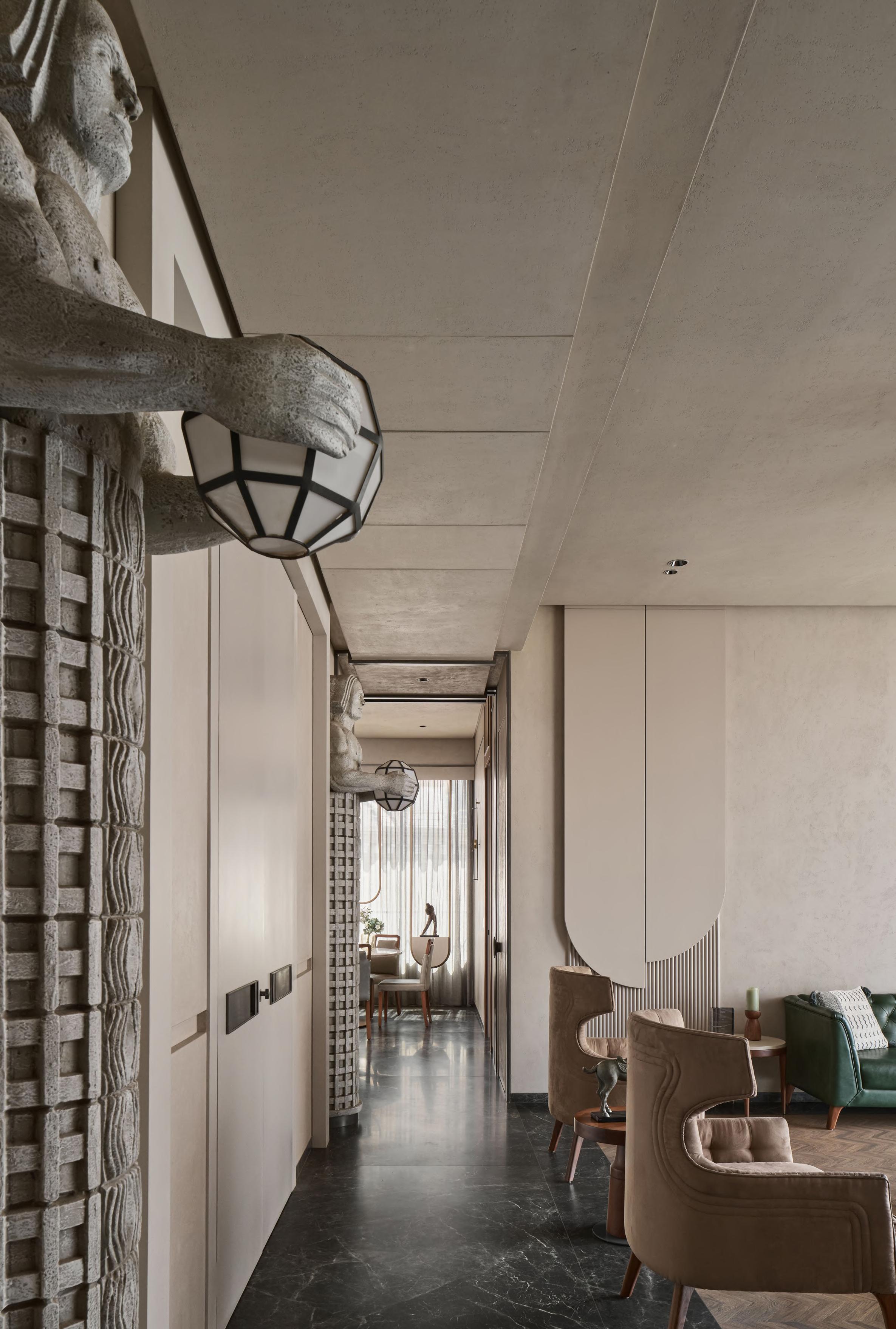 The spatial journey begins at the entrance corridor, which sets the tone with an unexpectedly theatrical flourish. Brutalist-inspired figures — sculpted directly into the wall — hold polygonal lanterns that illuminate the passage with a soft geometric glow. More than a corridor, this threshold functions as a gallery in motion, where concrete textures and minimalist wall cladding build a sense of rhythm and monumentality. It’s a bold but controlled first impression, signalling the home’s ethos: quiet drama, intentionally measured.