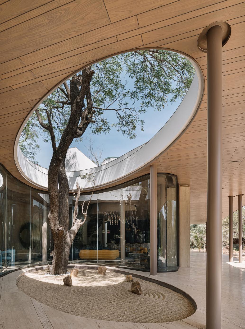 The preserved tree beneath the circular skylight is not a feature; it is a philosophy. The space is not an outhouse; it is a sanctuary for connection. Here, architecture does not rise above the landscape—it rises with it.
