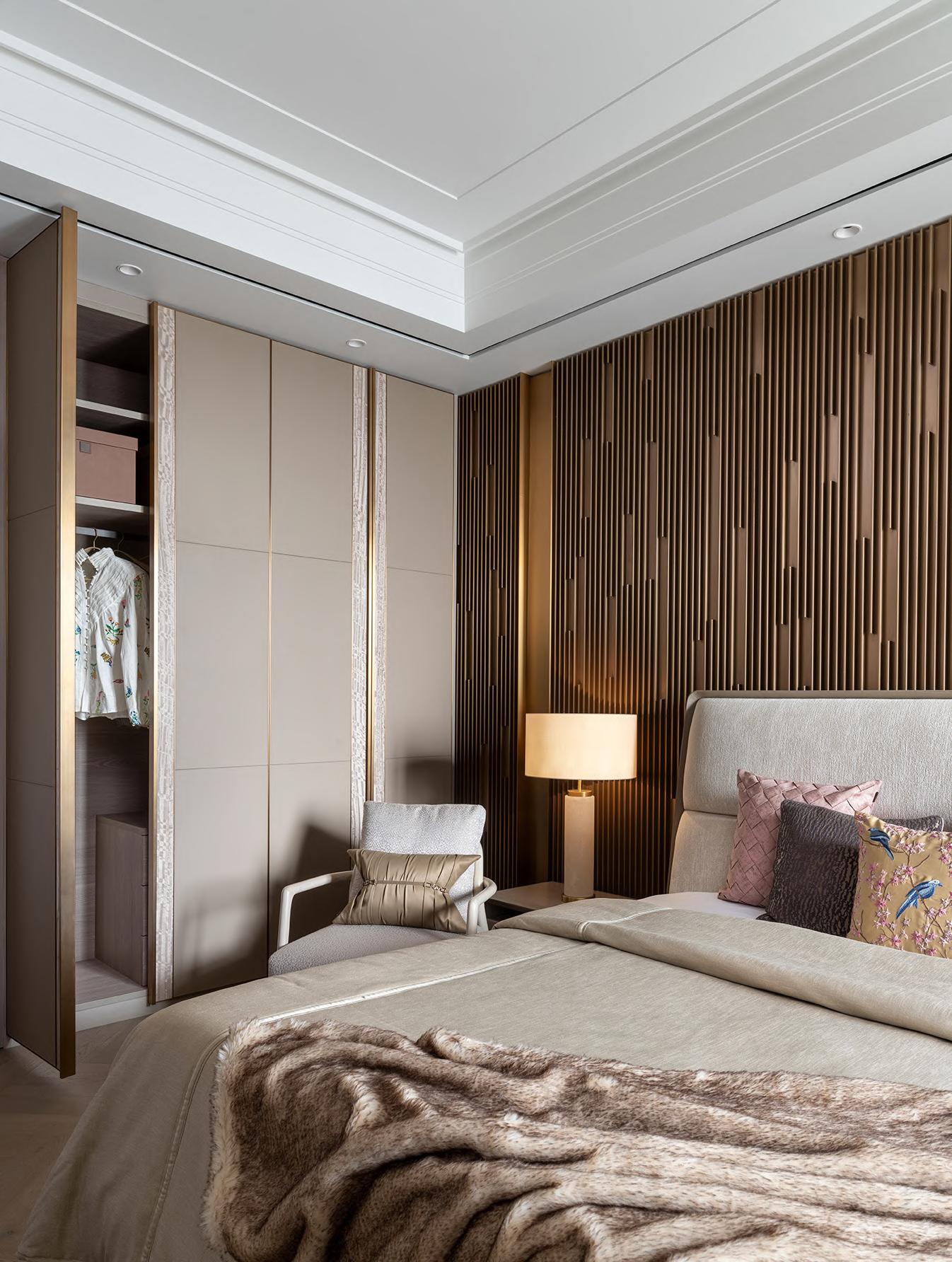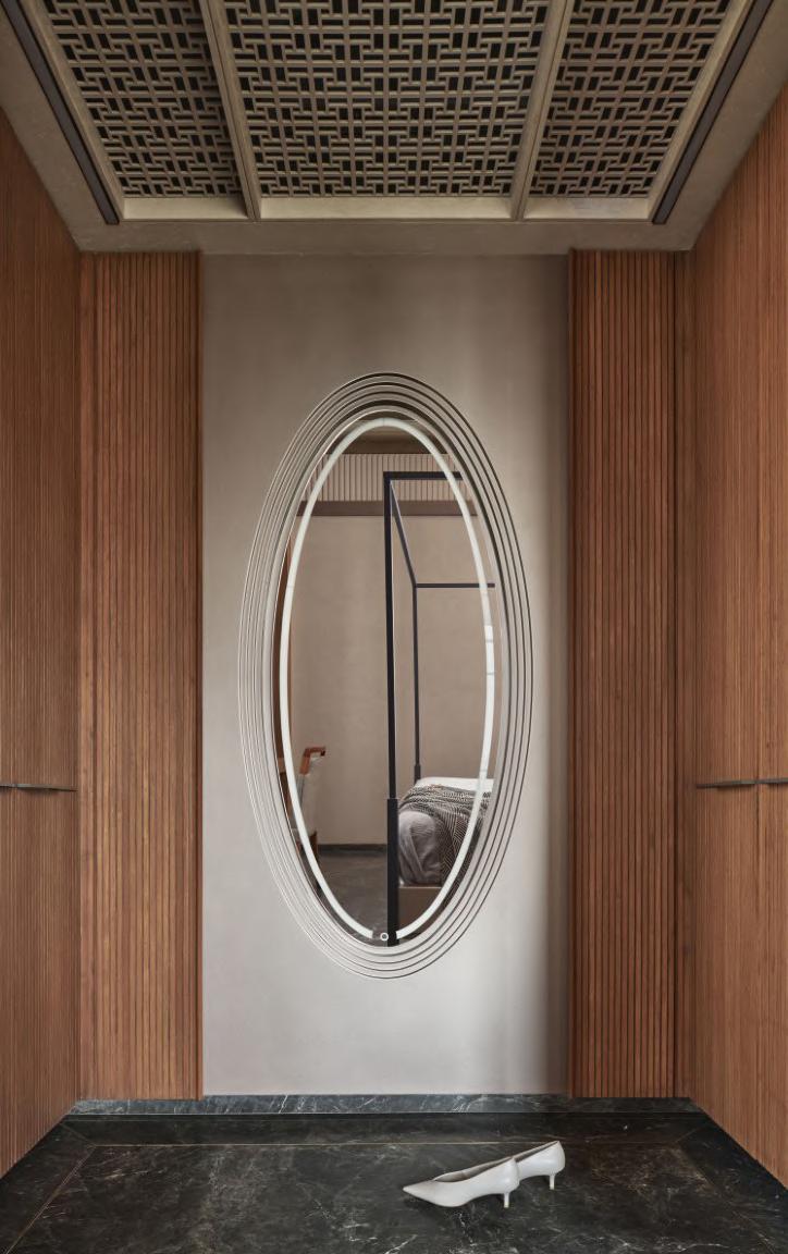 The home’s architectural language continues through the wall panelling, a thoughtful composition of natural veneer, brushed metal, and solid wood. The veneer—distinguished by delicate grainwork and a vintage brass finish—anchors the palette with texture and warmth. The result is an enveloping backdrop that quietly enhances the room’s architectural proportions, whispering luxury rather than announcing it.