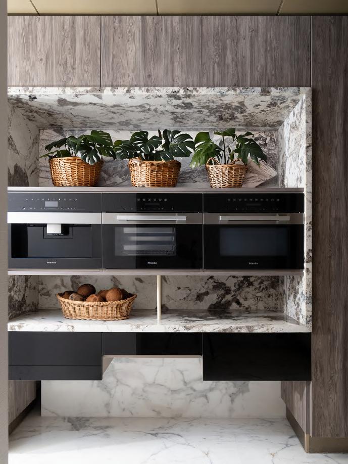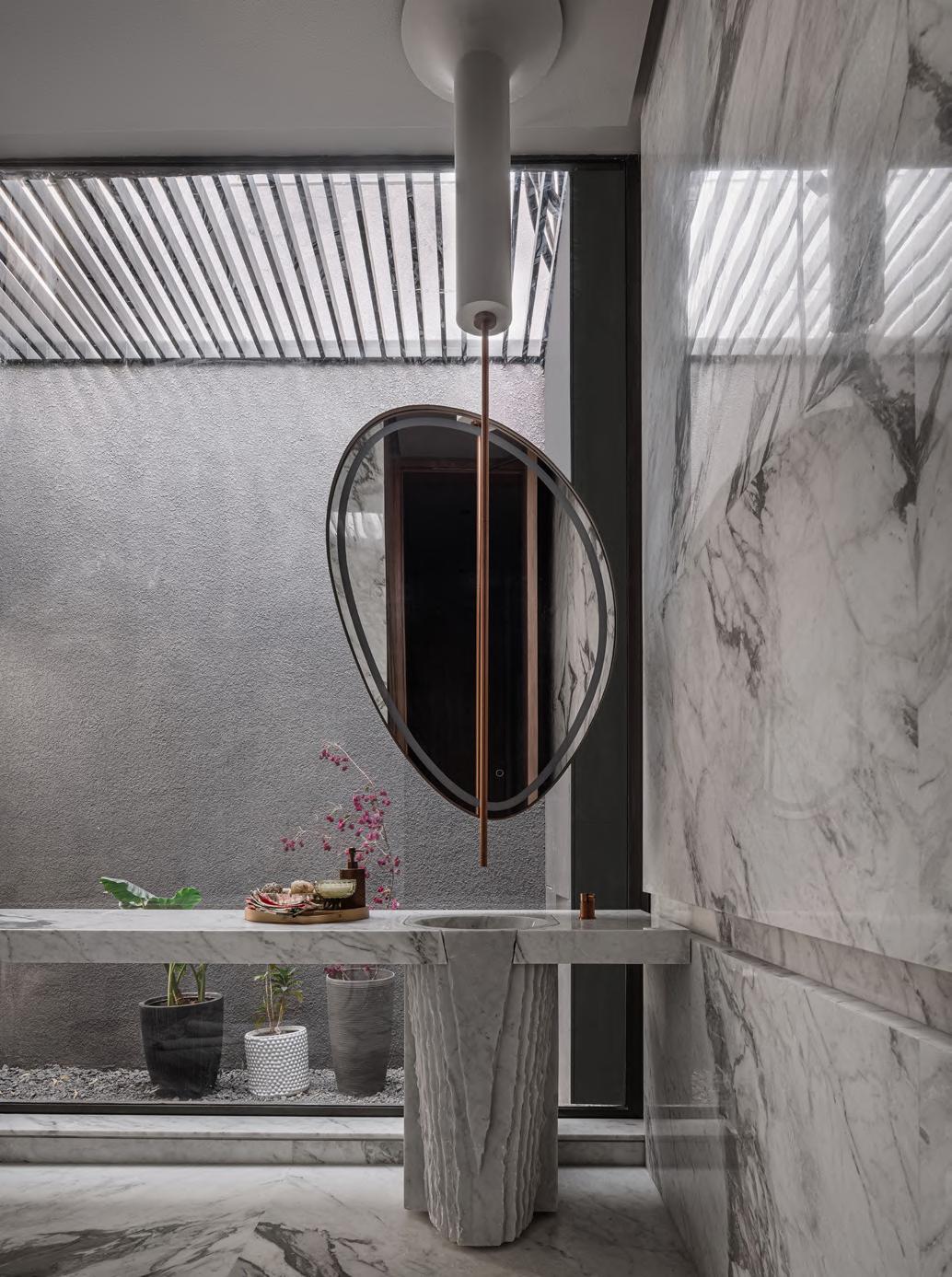 Inside, the architecture becomes a symphony of contrasts. Stone and marble converse across surfaces; sleek lines play against organic curves; sculptures integrate seamlessly into functional design. Luxury here is crafted not from abundance but intention—every gesture is considered, every finish deliberate.