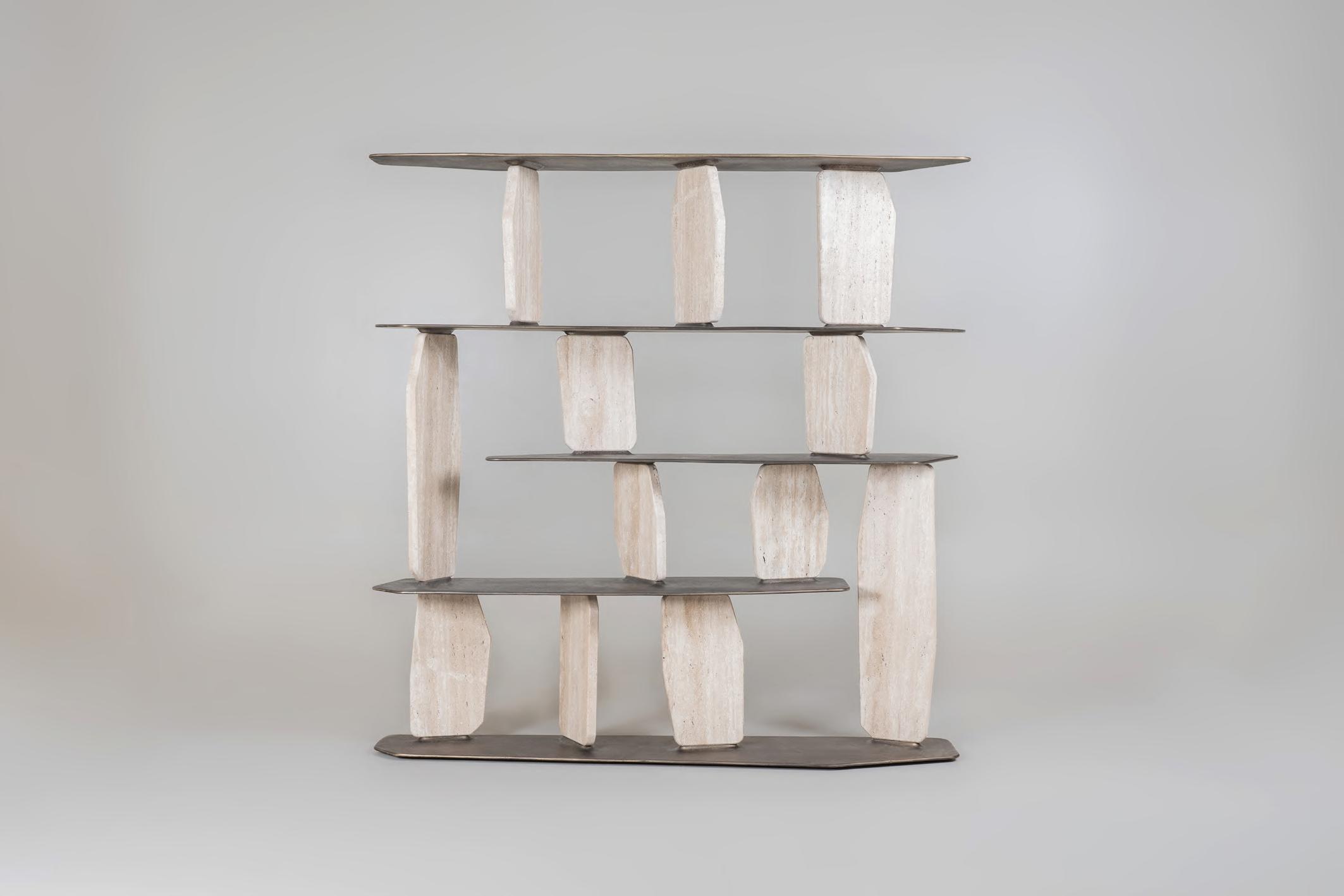 Completing the space, the Gilded Bookshelf rises like a vertical art piece. Its metallic accents offer subtle luminescence, acting both as a functional display and a punctuation of visual rhythm. Together, these elements form a living environment that is elegant, composed, and deeply personal.