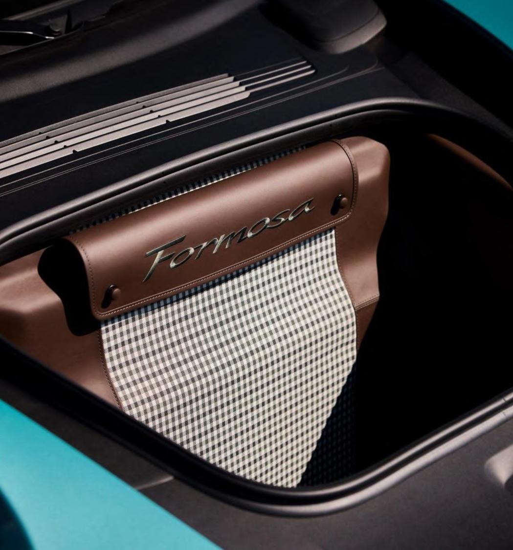 in bi-colour Truffle Brown and Black leather are accented by Night Green stitching. For the first time, Porsche introduces the “Formosa” chequered pattern in Night Green, Black, and Cream White, gracing the seat inserts and leather-lined front boot, which proudly bears embroidered “Formosa” lettering. Illuminated door sills read “Formosa x Sonderwunsch,” and headrests carry an embossed “Formosa” logo – a delicate blend of ocean waves, mountain peaks, and the 911 Carrera T silhouette.