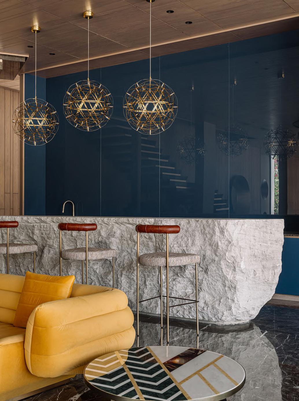 A sculptural stone bar anchors the social zone, its raw tactility juxtaposed with refined surfaces. Nearby, a floating