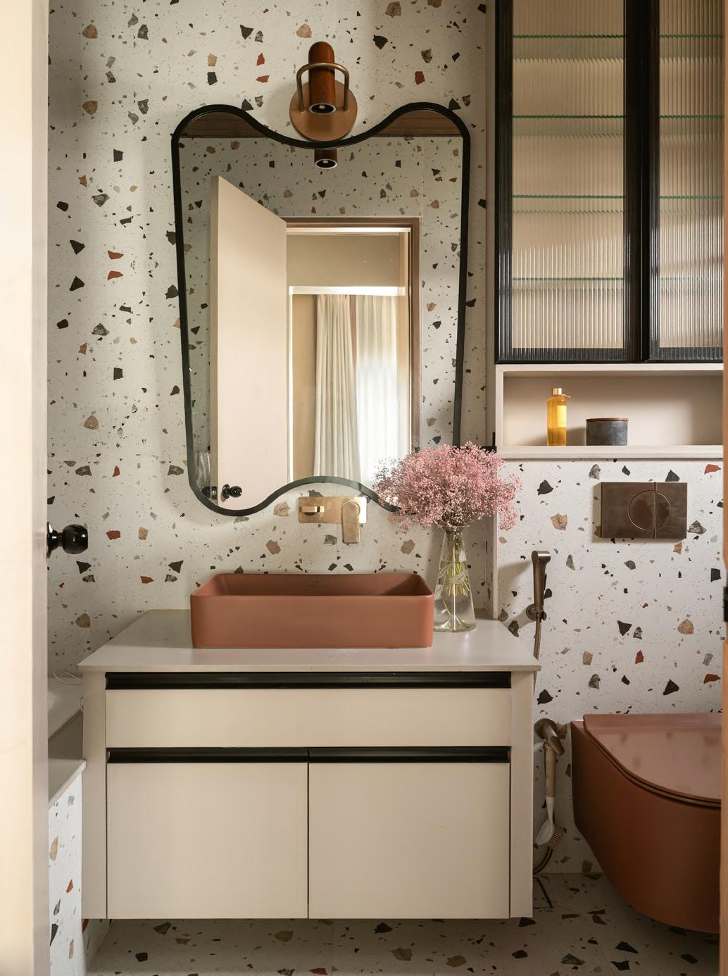 The kitchen leans into bolder contrast. Sleek grey cabinetry meets terracotta-toned shutters, with black granite countertops grounding the palette. It is a practical yet visually striking composition — one that speaks to the designers’ ability to marry subtle tonal shifts with confident accents.