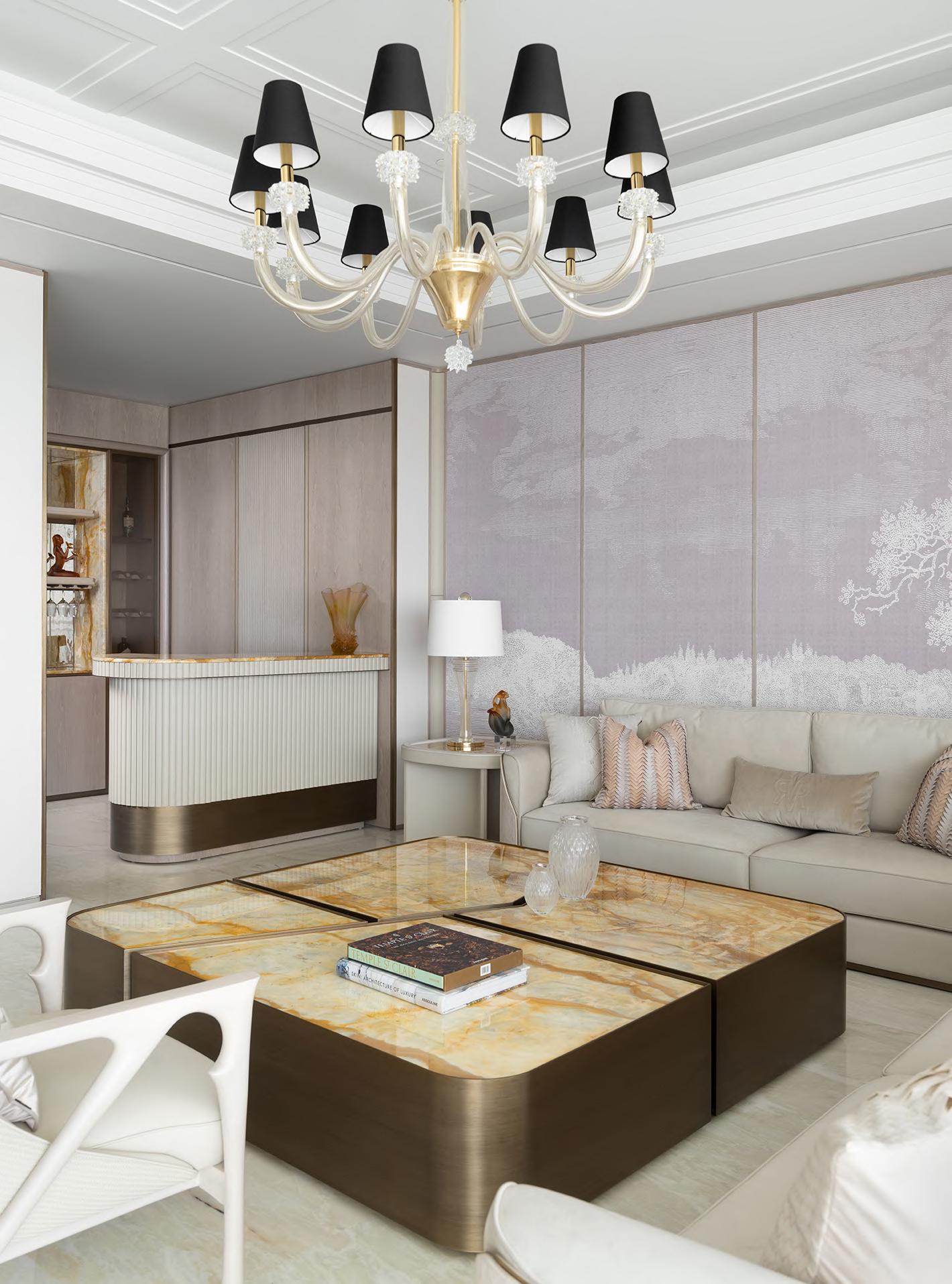 softness and structural poise defining the atmosphere of calm sophistication. Opposite, the sculptural Palladio Coffee Table introduces a sense of grounded artistry, anchoring the room with geometric presence.