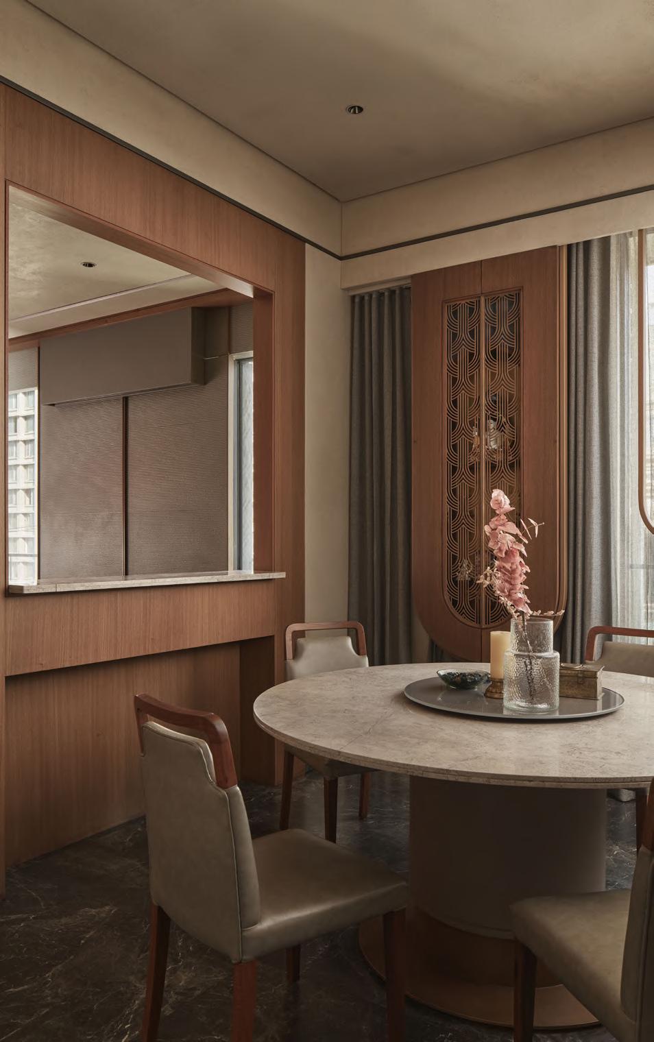The dining area continues the dialogue between softness and structure. A circular marble-topped table is surrounded by curved-back chairs, echoing the home’s fondness for rounded silhouettes. Fluted panelling and custom-designed screens shape the space, offering visual definition without compromising openness.