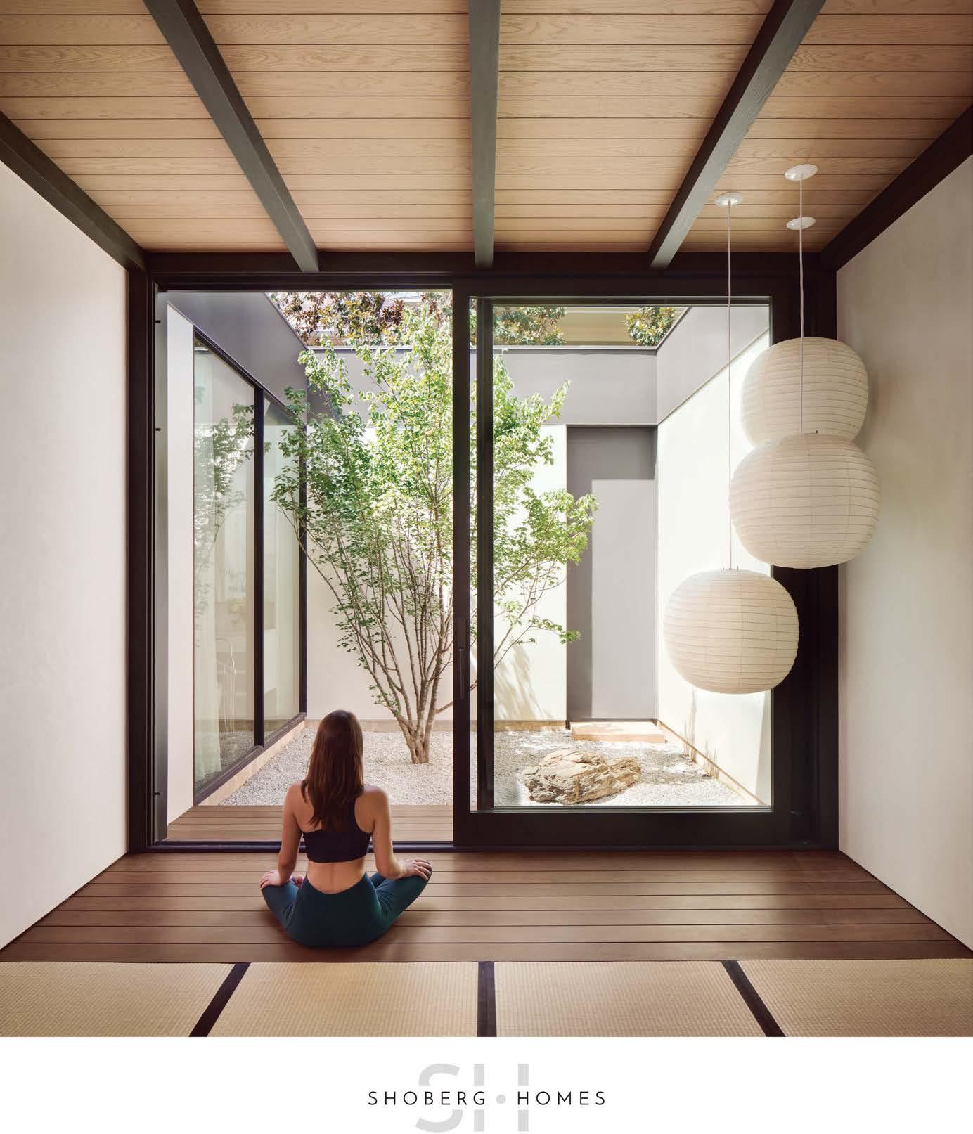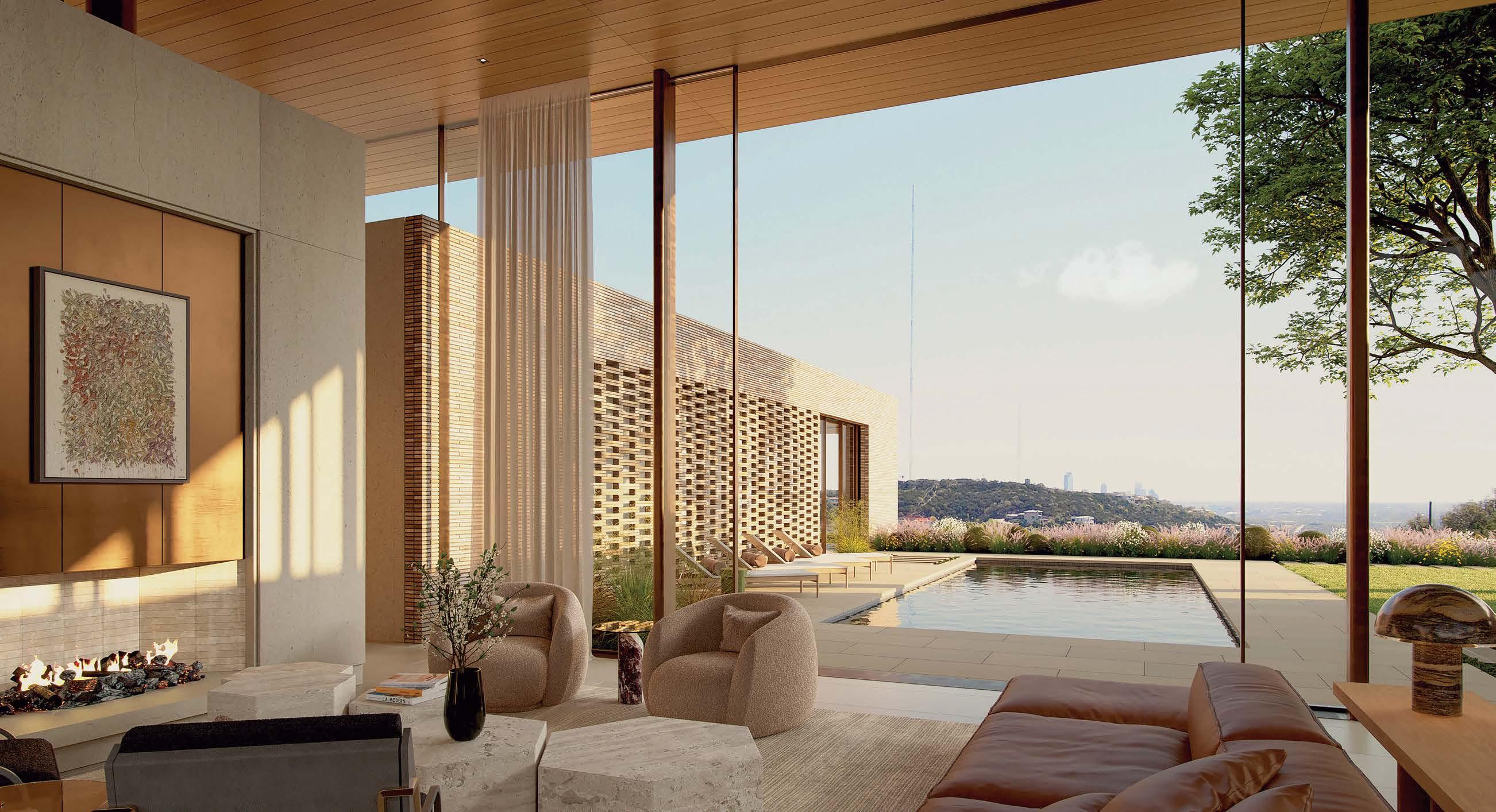 color and contrast.” To that point, lighting designers Granville McAnear and Balthazar Cordero illuminated the ceiling coves in main areas such as the living room, kitchen and even the primary bathroom. Meanwhile, interior designer Carrie Hatfield, working in close collaboration with the clients, selected furnishings that underscore this desire for more juxtaposition. “The upholstered pieces feature clean lines to complement the architecture,” Hatfield explains, “but it was also important to balance those lines with rich materials. In this case, we used velvet and mohair upholstery, sheer wool draperies and light fixtures that really warm the space.”