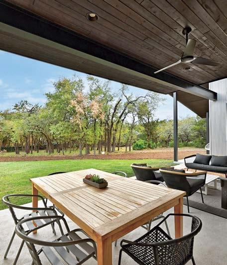 “The block has a mix of newer, larger residences and smaller, older ones,” Fruit describes. “We wanted to break down the scale so that the twostory volume was pushed farther away from the street,” he continues of the design, which was brought to life by builder Steve H. McCombs along with on-site superintendent Vaughn W. Shadle and project coordinator Lynn Livingston. Mut adds: “Although this is a neighborhood that welcomes a wide range of architectural styles, we didn’t want to create something that stands out.” With that in mind, the duo selected a quiet palette of Kansas Cottonwood buff limestone for both the exterior and interior walls as well as Flint Hills Gray for the stone floors. Accents of vertically ribbed wood siding surface on the second-story exterior façades. These inspired a wood-slat screen that covers the top of the living room’s window wall, which helps temper both the room’s grand scale and the southern sun.