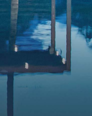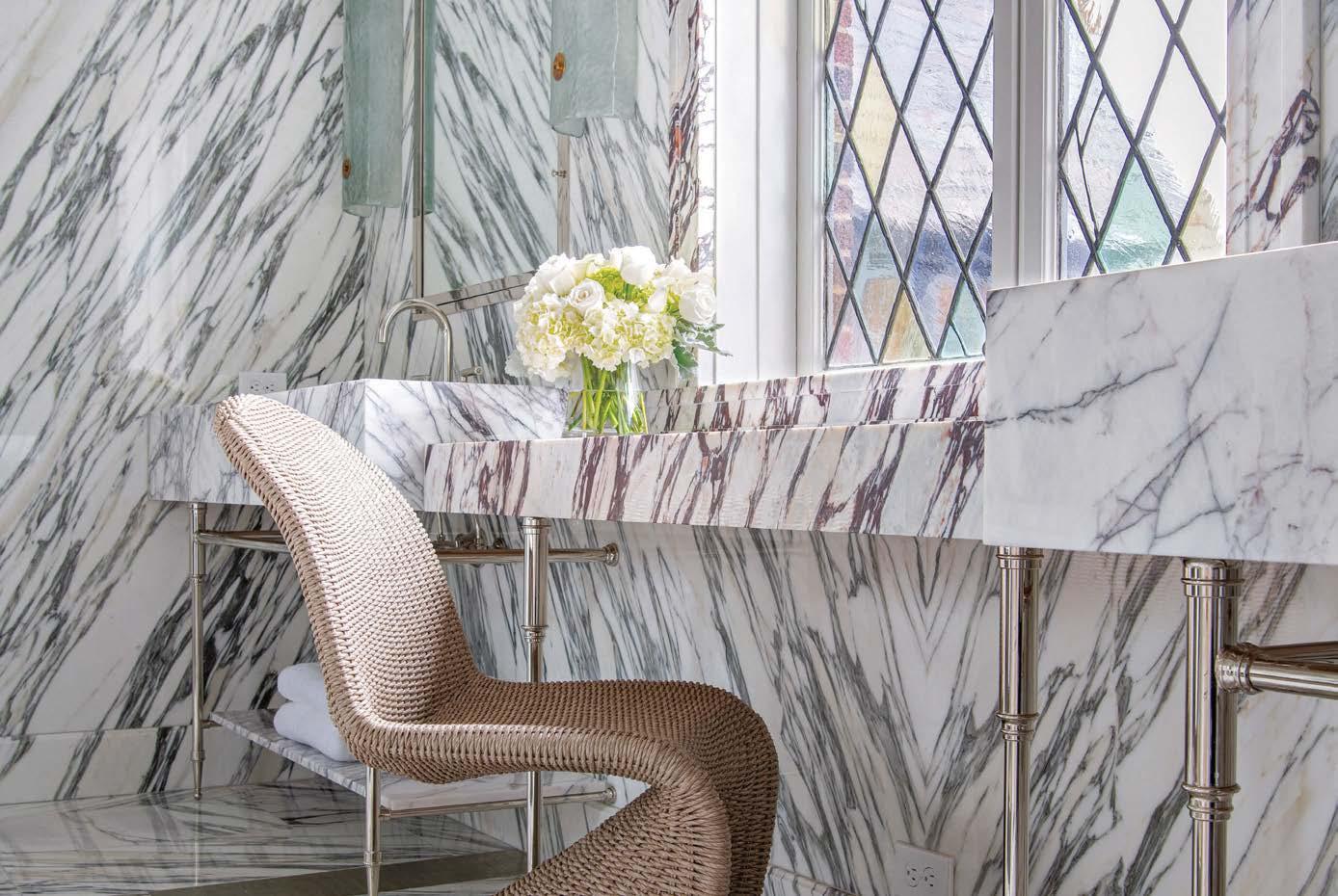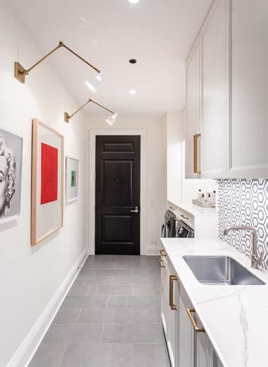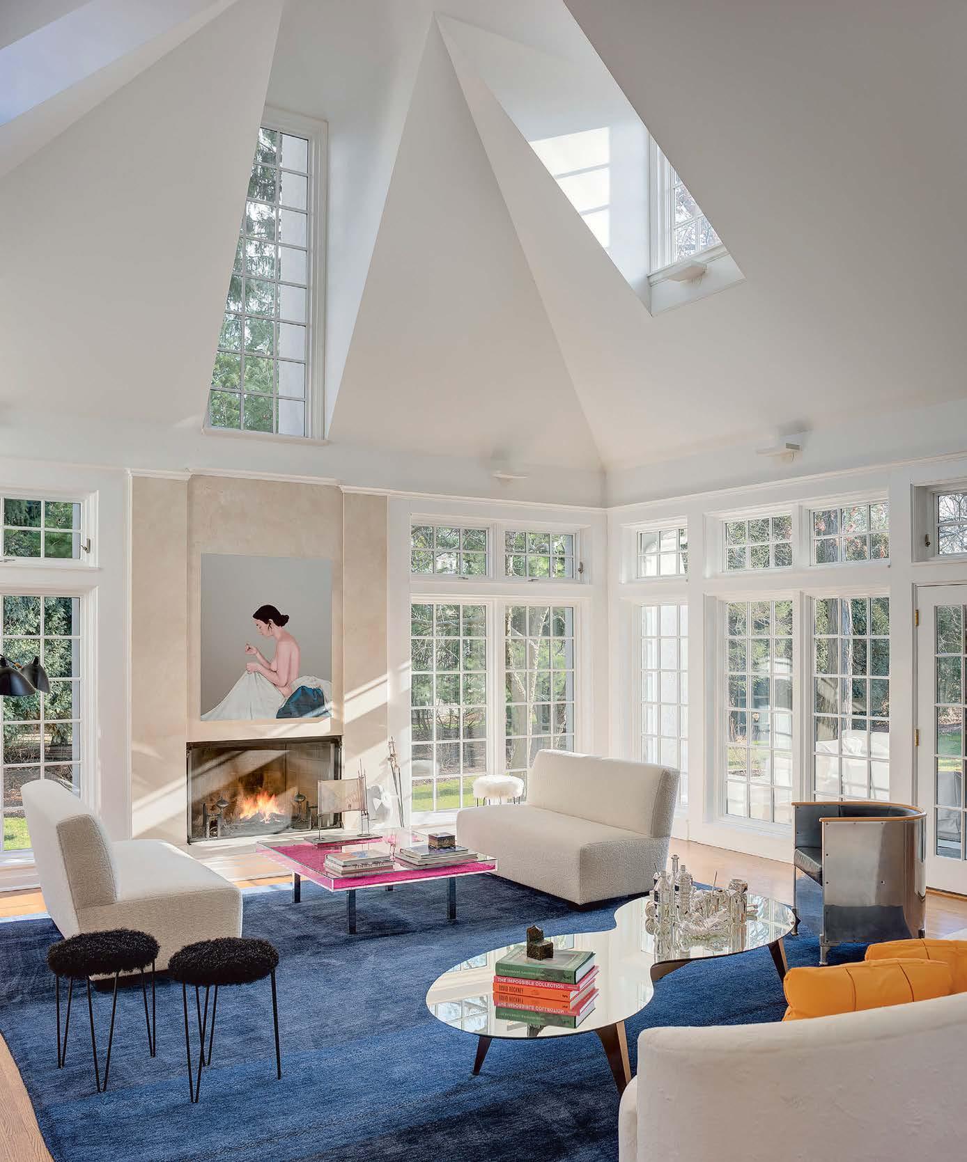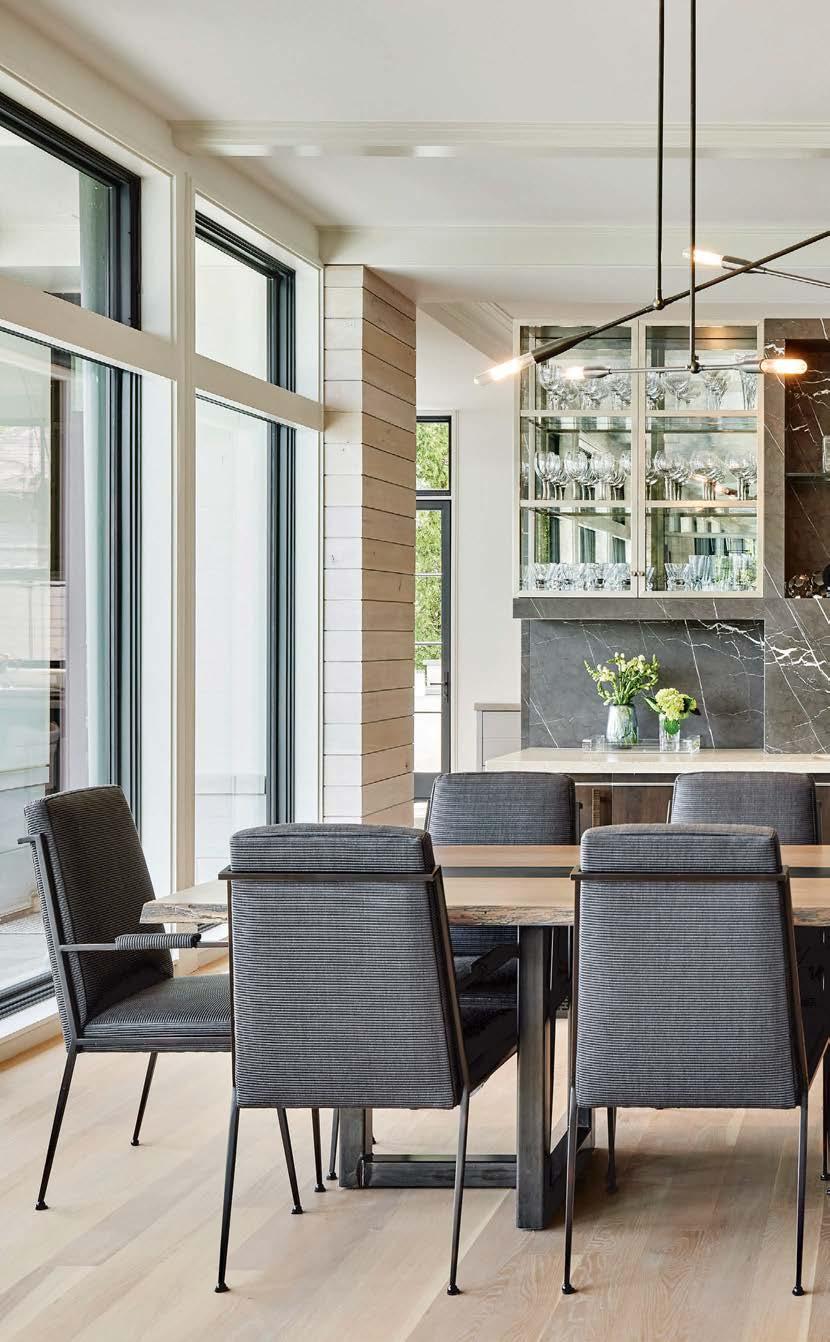 Once inside, the home immediately unfurls into the expansive living space, with the pool, sweeping lawn and lake filtering through a wall of floor-toceiling windows. Despite the open layout, Wilson still carved the great room into distinct entertaining enclaves by creating “a kind of enfilade,” he explains. Instead of hallways, spaces run into each other but remain defined by architectural structures. For example, the double-sided fireplace serves both the living room and four-season room while French doors allow light to circulate between the two. On the other end, a freestanding bar delineates the more formal dining area from the kitchen, allowing for cocktail hour on one side and morning coffee on the other. Lining the connecting spaces are custom built-ins constructed by builder Rocco DeFilippis to cleverly conceal supporting steel columns. These floating bookshelves ground the center while framing the lake vista beyond. “Everything flows