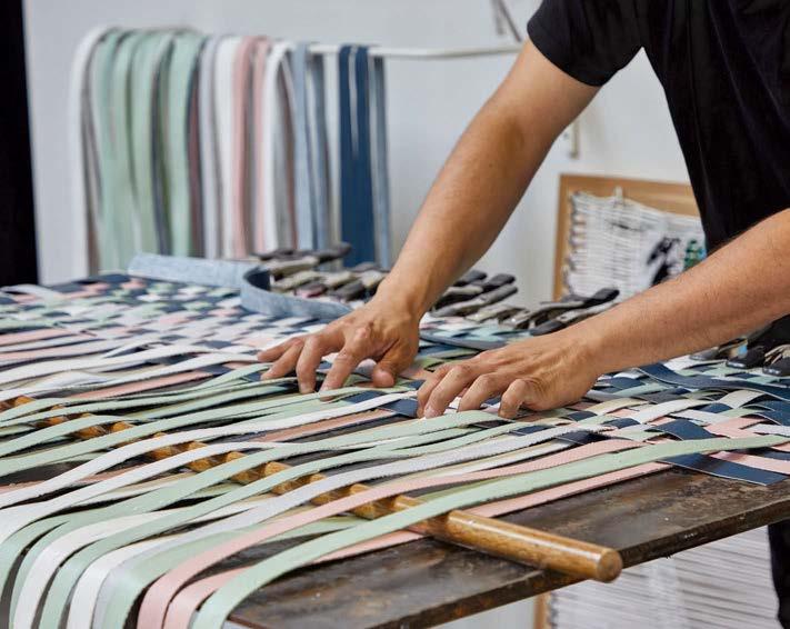 A central part of Salvador Dominguez’s practice is exploring time-honored craft techniques with nontraditional materials (below). A selection of vessels—both finished and in-process—are styled after woven baskets (left). His tile paintings, such as those wrapped with molds of vinyl tablecloths (bottom, left), speak to his upbringing in L.A. He uses 2D sketches (bottom, right) and 3D samples (opposite) to experiment with new directions and components.