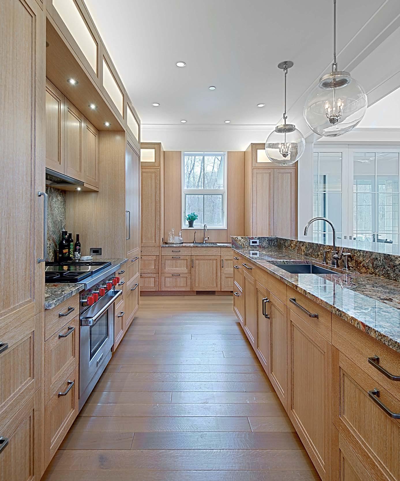 This stunning space features custom oak cabinets with leather handles, a backsplash from Artistic Tile that looks like plaster, a matching plastered range hood and the client’s own artwork.