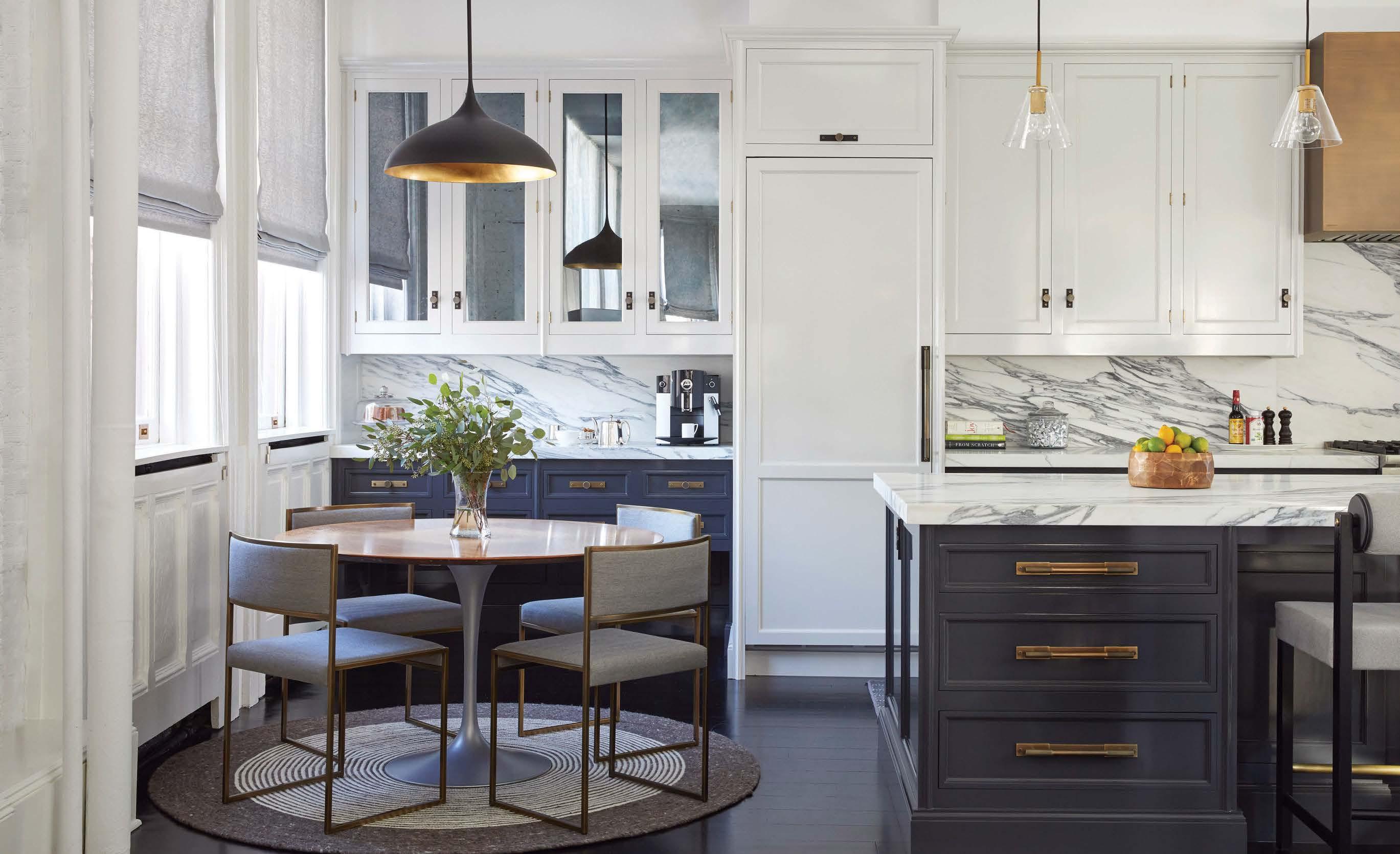 Opposite: Benjamin Moore’s Vintage Vogue coats the kitchen cabinetry, complementing Calacatta Primavera marble from Aria Stone Gallery on the countertops and backsplash. Dornbracht’s Tara Classic faucet is from Ferguson Bath, Kitchen & Lighting Gallery.