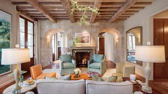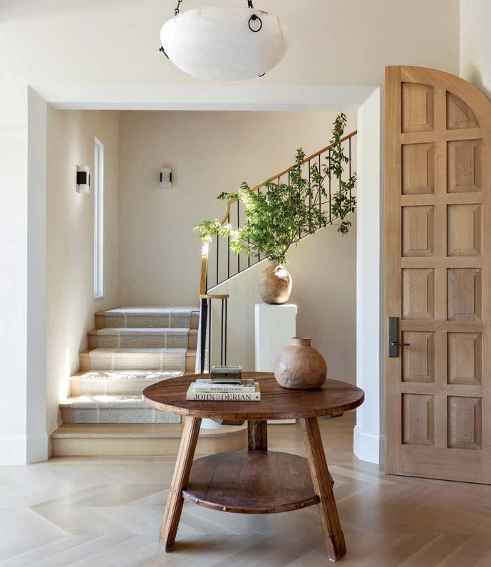 With builder Teresa Duffin and her project manager, Kenny Torres, also on board, the couple enlisted Dorsey to update the interiors. “My clients wanted it to be livable, and they liked my ‘relaxed luxury’ style,” he recalls. Working with his senior designer, Georgia Bass, Dorsey began to reimagine the home in a more contemporary way while honoring the existing Mediterraneaninspired styling. To that end, one of the first tasks was replacing the living room’s series of French doors with a retractable design to enhance the vistas. Throughout, the team continued the transformation by embracing “timeless materials like natural stone and plaster walls to add texture and warmth without a lot of color,” Dorsey notes. Since the clients frequently entertain, a key to furnishing the interiors was finding pieces that easily transition from place to place. “That way, if they need to rearrange a chair during a party, it will still look great,” explains Dorsey, who sourced items both online and on buying trips. Beginning in the living room—which serves as a pass-through to the kitchen and family room—he brought in an assortment of upholstered seats to suit the light and airy color palette. “The view out onto the verdant hills has a calming effect, and we wanted that to be reflected in the furnishings and to set the tone for the rest of the home,” the designer explains. Grounding the soothing space are