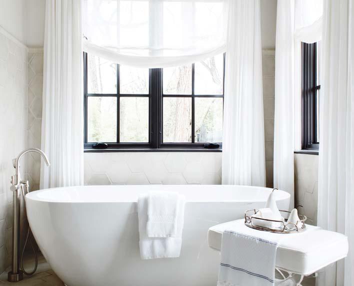 Top This sleek, creamy palette marries a husband’s preference for modern style and a wife’s for vintage French. Left A white-beaded chandelier takes this classic dining room from beautiful to show-stopping. Right Stone hex tile walls and a white porcelain tub are a vision of softness amongst the floor-to-ceiling sheers and relaxed window valances. Opposite left Custom pillows add a pop of color and movement, bringing depth and energy to this creamy living room palette. Opposite right Coordinating wood tones and touches of dusty blue make for a chic country French style kitchen.