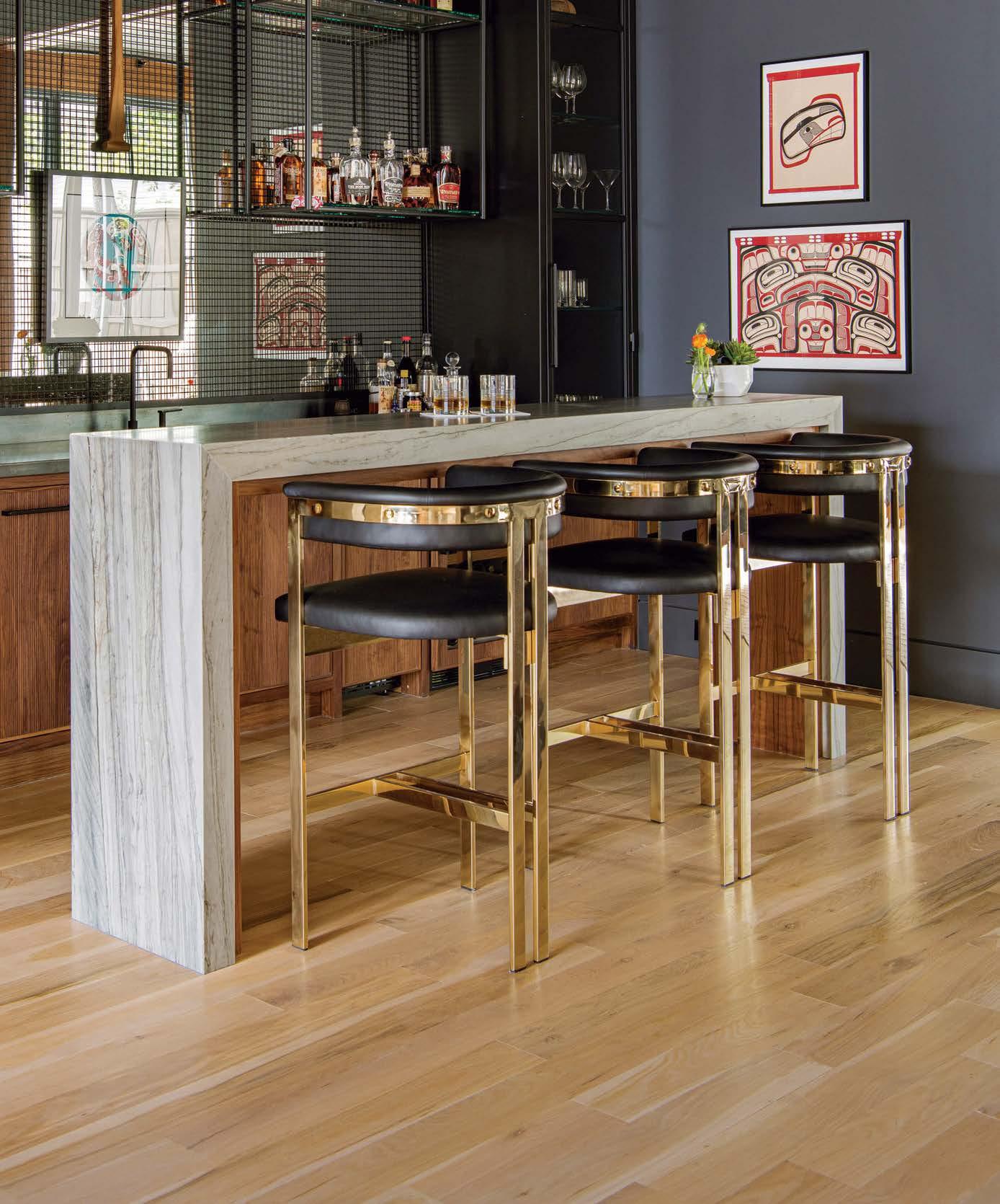 Above: Cassina counter stools from Scott + Cooner pull up to the kitchen island’s custom brass top and base below pendants from The Urban Electric Co. Throughout the first level, wood floors are from BoardHouse.