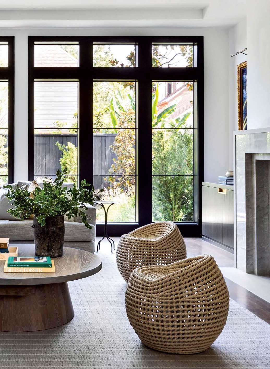 Rather than forming a traditional centerhall floor plan, Stocker worked with his project manager, Scott Nunn, to create a rectangular footprint with one short end facing the street and the long sides lined with tall windows. These overlook outdoor areas devised in collaboration with landscape designer Matthew Murrey, which include a courtyard and covered terrace. “Using a rectangle gave us the ability to pick up a ton of light and bring it deeper into the house, which helped us achieve bright and airy spaces,” Stocker explains.