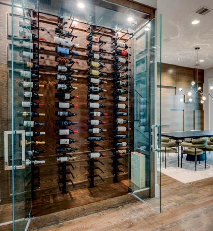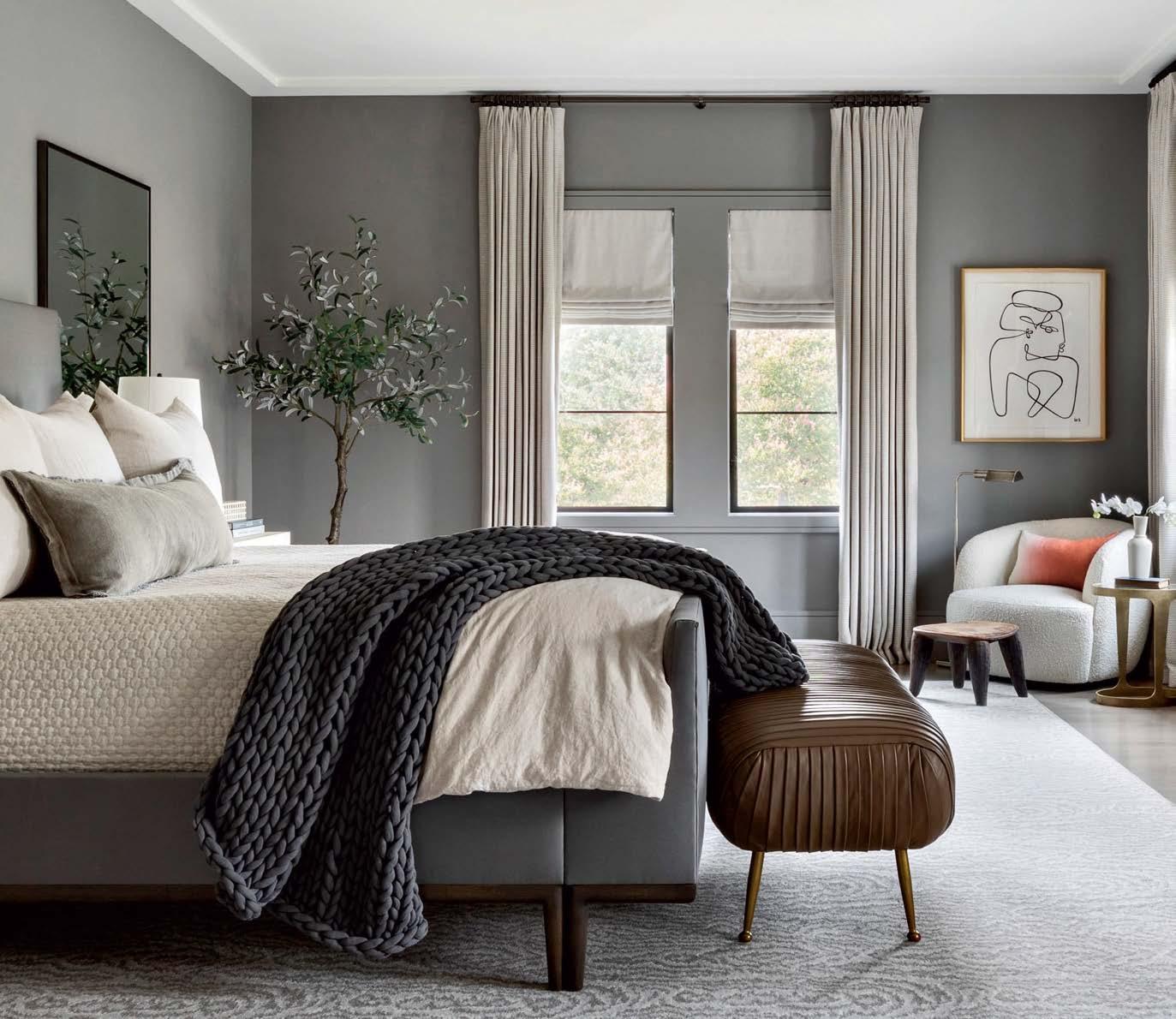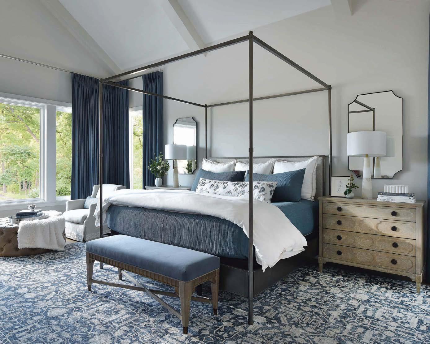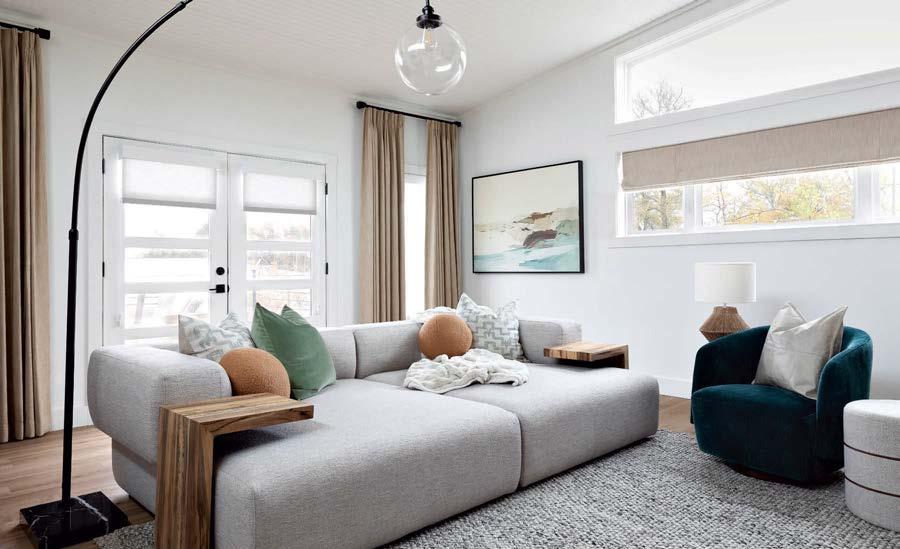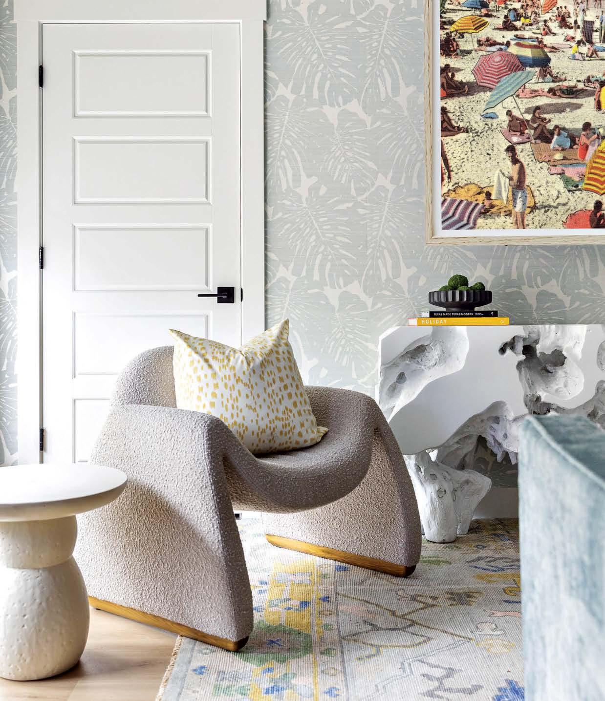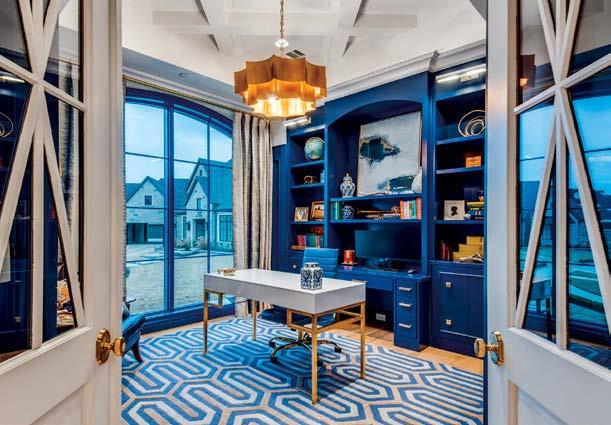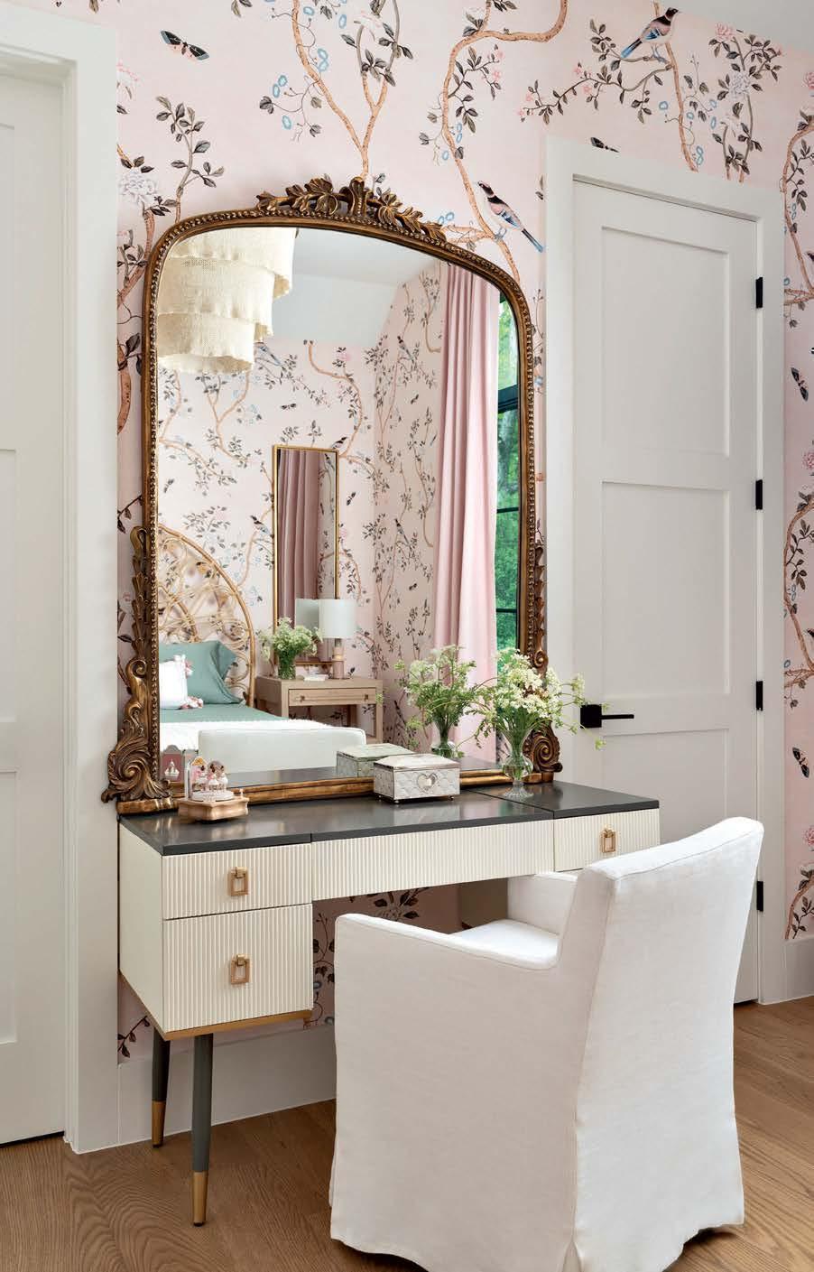 This home also provided the family a chance to truly personalize their spaces. “We wanted a real Mom-and-Dad area,” Tom explains, noting they had not prioritized their bedroom in previous homes. Now, however, these parents have the retreat they always envisioned, made all the more inviting by a fireplace. The children also had a say in their rooms, with the daughter helping select her own wallpaper. “They’re at an age where they have a lot of opinions, so we wanted them to be involved,” Tom says. And along with a polished office for Kim and an upstairs family hangout (complete with a big sectional and projector screen for cozy family gatherings), you’ll find a guest suite nicknamed “The Cottage” situated above the garage. “It gave us the opportunity to have some fun with the design,” says the husband, referencing the double queen-size beds and wallpapered ceiling. Adds the wife: “Tom’s family visits from England for long stretches, so we wanted them to have an escape, and it feels like their very own little bedand-breakfast.”