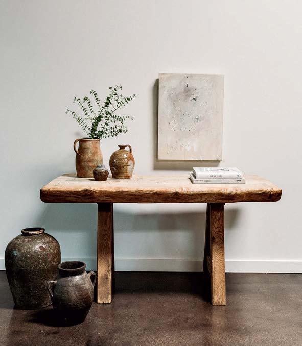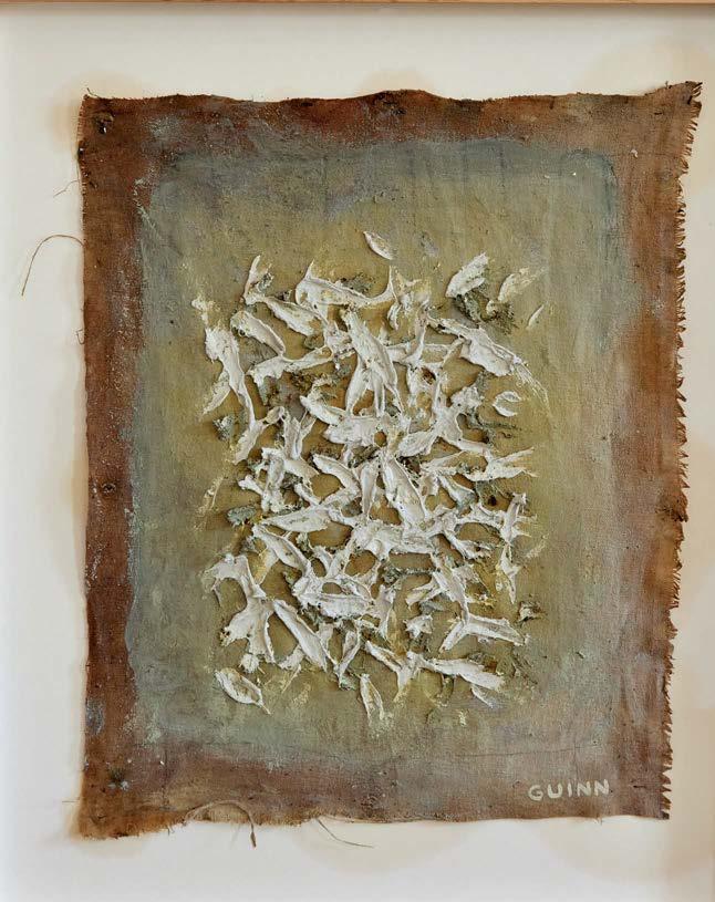 A visit to the artist’s Austin studio reveals his unique process. Brimming with furniture, ceramics and houseplants, the space feels like a home, with Guinn constantly rearranging its contents. “I like to shift things around and create in different spaces, different lights,” the artist notes. You’ll find materials he’s gathered from the natural world, including dried plants and gritty dirt that end up incorporated into his fine art pieces. In turn, his paintings—with their rich texture, subtle color and organic elements—are very much at home in interior environments.