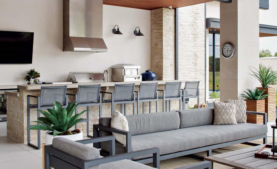 Top Year-round entertaining is a breeze in this outdoor living space, with retractable motorized screens, in-ceiling heating elements and a kitchen and bar. Right Custom floating nightstands in fumed, black-stained oak are mounted on a rich, leather-upholstered wall—all encased in walnut wood paneling. Center Fornasetti wallpaper, a custom-stacked wood vanity and a faceted glass sink are just a few details that will leave one’s head in the clouds in this ethereal powder bath. Far right Whether one is enjoying a fireside chat or morning coffee, this serene primary bedroom’s neutral palette and velvety carpet invite relaxation.
