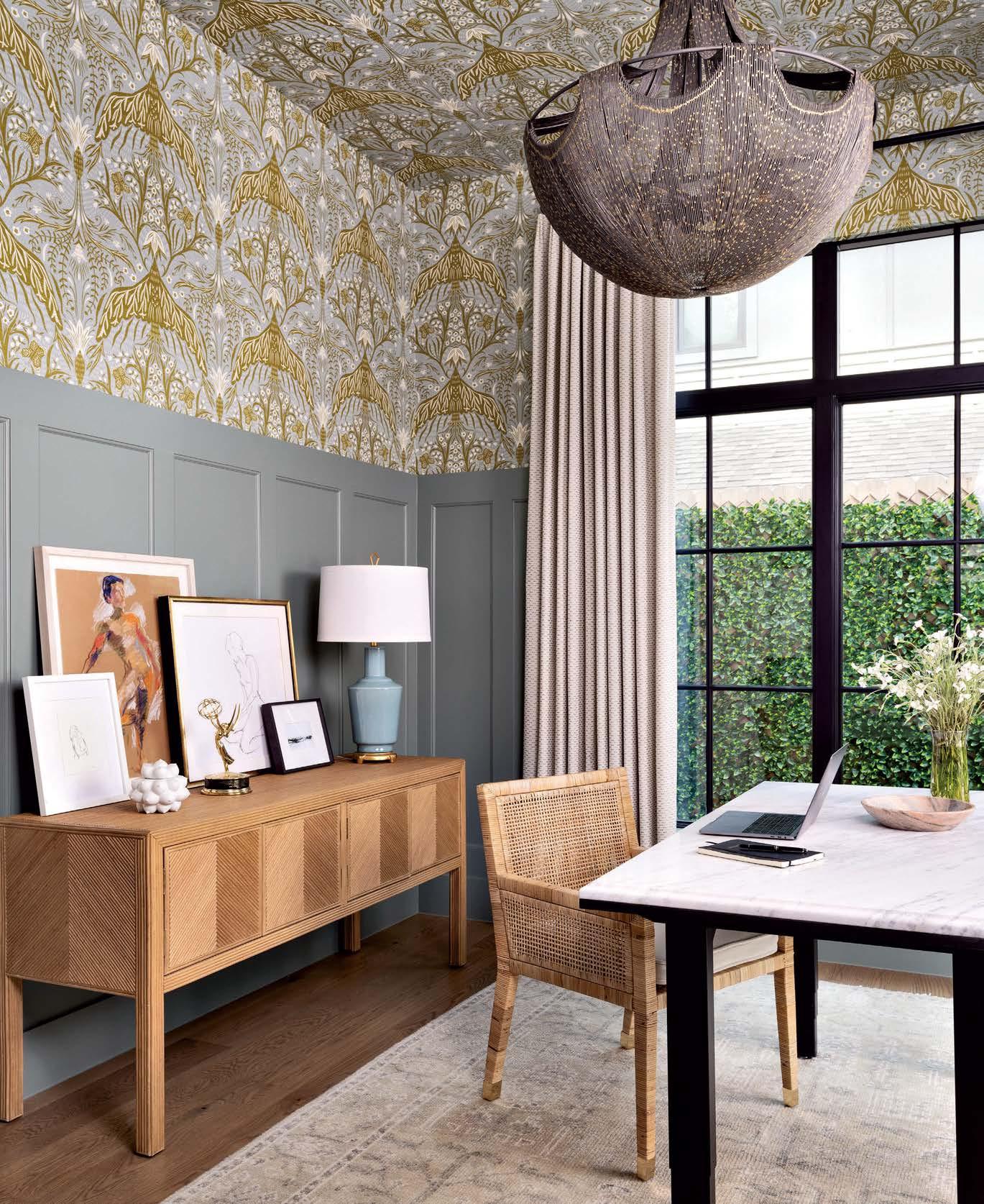 Opposite: The office features an Uplift Desk design and Serena & Lily chair. Spoonflower’s wallpaper meets paneling painted Benjamin Moore’s Rushing River. Currey & Company’s Eduardo chandelier illuminates a Jaipur Living rug.
