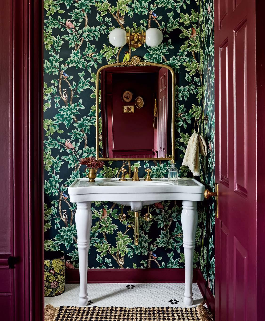 Right: William Morris’ Pimpernel wallpaper from Culp Associates partners with moody subway tile in the powder bath. Geneva sconces from Visual Comfort & Co. flank Arteriors’ Edmund mirror. The Waterworks faucet is from Alexander Marchant.