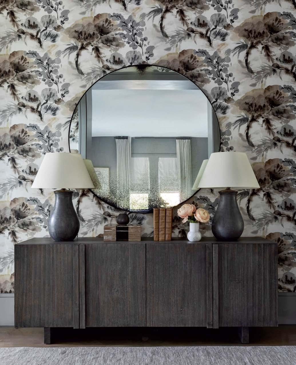 Opposite: Carlisle & Co.’s Shangri-La wallpaper from Holly Hunt enlivens a main bedroom wall behind a CB2 mirror. The dresser from Jayson Home is topped with lamps from Dixon Rye.