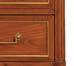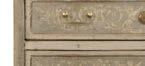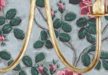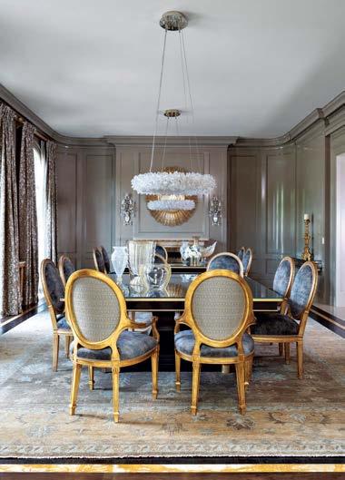 Woolery also searched for a middle ground when marrying the traditional furniture style the homeowners love with lively bursts of color and pattern. “My passion is finding things that will stand the test of time without appearing dated,” she says. “I’m also not afraid to go for it with color. I grew up when chintz was popular and prints were bright and vibrant, and I still gravitate toward that.” The designer’s penchant for decorative motifs is evident in the dining room, which features a glossy white ceiling and custom, hand-painted wallpaper panels shimmering with tints of rose gold. These selections provide a fresh context for the 19th-century sideboard, mirror and chandelier, as well as a vintage pedestal table “that could have been in your grandmother’s house,” Woolery notes with a laugh.