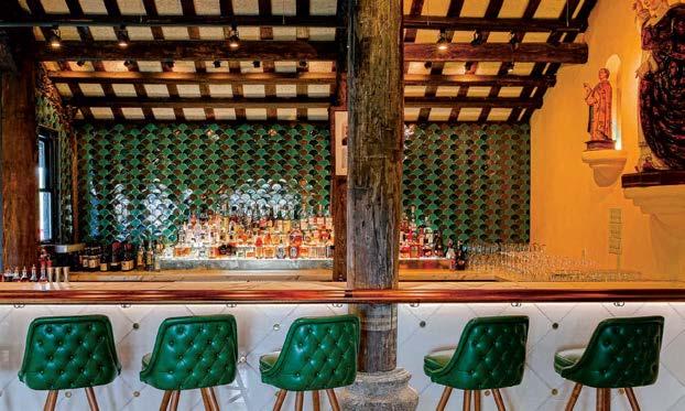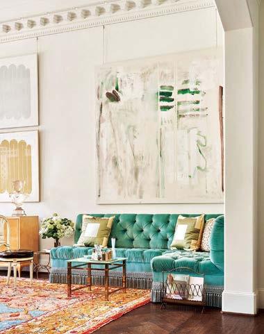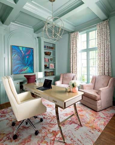 From there, the combinations grow bolder. Turquoise millwork pairs with a tête-à-tête upholstered in an energetic orange Art Deco print in the game room. Spirited, red-striped swivel chairs and Technicolor embroidered stools appear in the family room. And, perhaps most daring of all, a classic bird-and-thistleprint wallpaper pairs with Jolly Rancher-green millwork in the wife’s office. “That move took some convincing,” Woolery recalls of the latter. “But I’ve found that pushing my clients beyond their comfort zones often leads to the most successful rooms.”