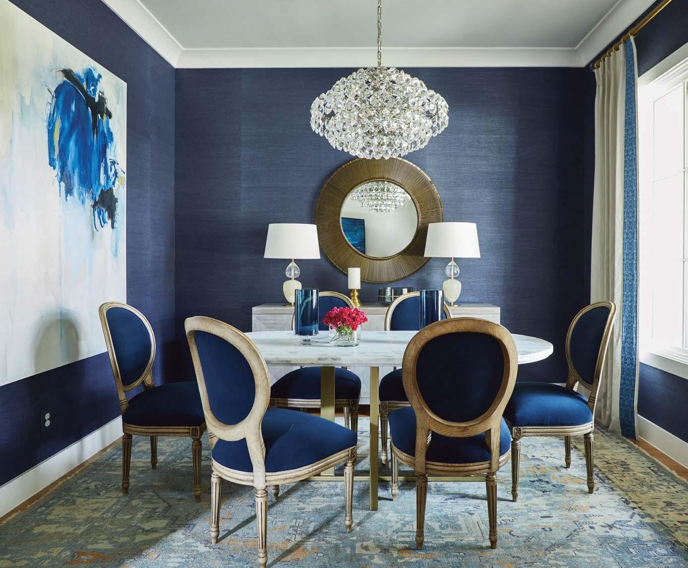 Above: Gracie wallpaper establishes the dining room’s blue-and-blush palette. Bespoke chairs from Sedersi, Inc.—with Rose Tarlow Melrose House glazed linen on the front and Holland & Sherry cashmere wool on the back—surround a vintage Baker table. The chandelier is from Legacy Antiques.