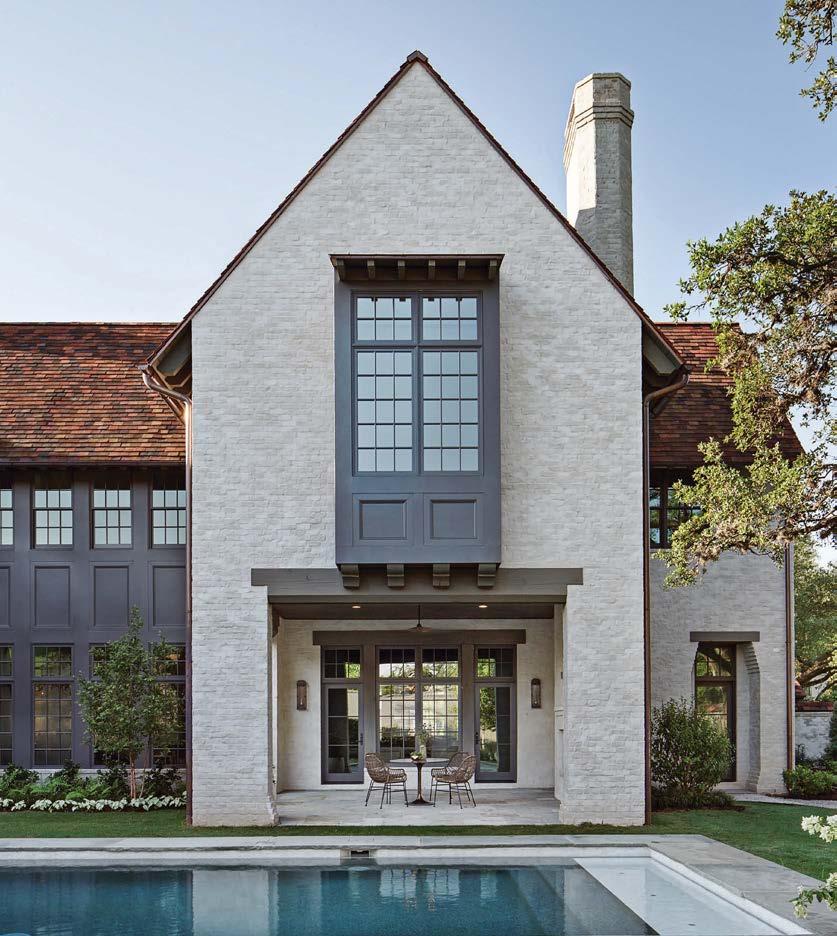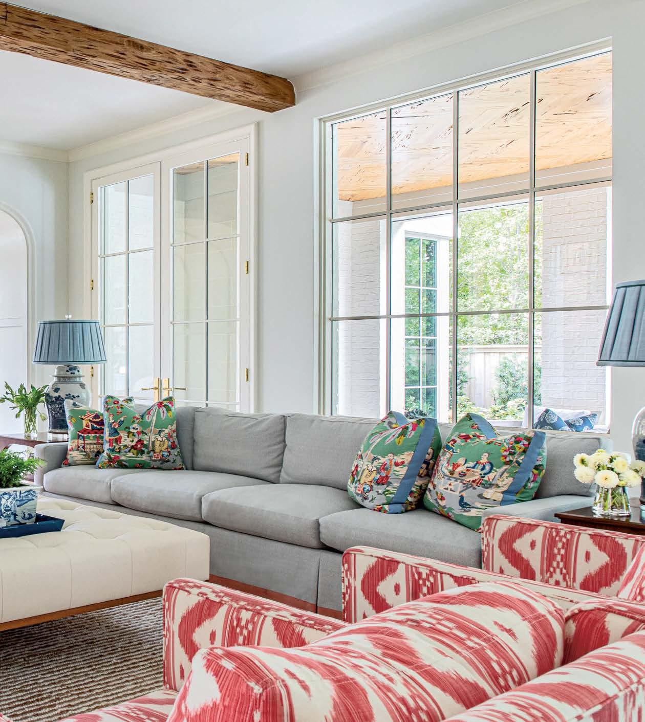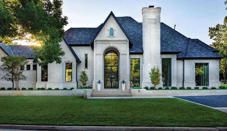 any of the houses in this new home’s Dallas neighborhood follow a scheme that situates a square dwelling in between front and rear yards of roughly equal size. But more than anything, these owners wanted to let in the light—which meant a side-yard design with more perimeter was in order. Years spent in a residence decorated in tones of gray and khaki had left the pair yearning for surroundings that felt “bright, cheerful and happy,” explains interior designer Kristen Woolery, a friend of the wife’s since grade school. And so, when the couple began working with Woolery, architect David Stocker and builder Robby Skinner on a custom home for themselves and their children, the first consideration was windows.