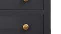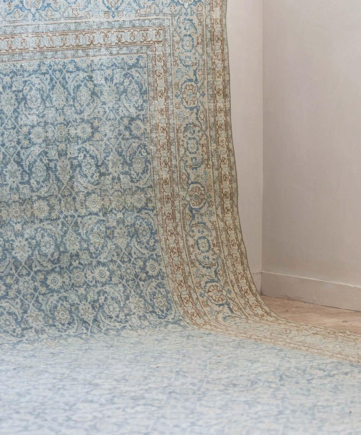 Above: Kitchen cabinetry painted Farrow & Ball’s De Nimes complements a vintage rug found on Etsy. Brass accents include a Waterworks faucet from Alexander Marchant, Savoy House Glenn wall sconces from Hinkley, Inc. and pulls from Rejuvenation.