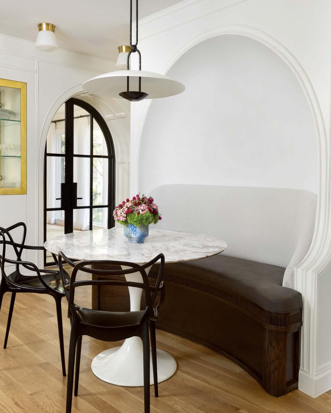 Above The Urbanology Cottage welcomes guests to bask in Ginger Curtis’ “relaxed modern” approach to design. Top Located outside of L.A., this casual dining space has a roomy and relaxing leather-upholstered bench and two comfy chairs that are perfect for a family of four.