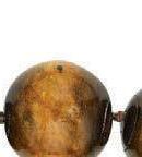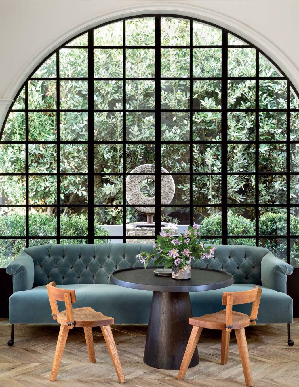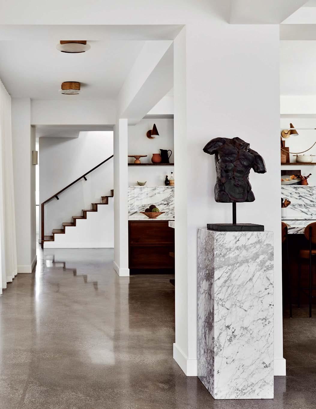 Above: Organic themes appear throughout the house, including in this downstairs bathroom. Brass faucets by Graff complement tan marble, while opal Edie sconces by Lightmaker Studio, artwork by Joshua Dai and an assortment of ceramics by Linette Dai lend artisanal touches.