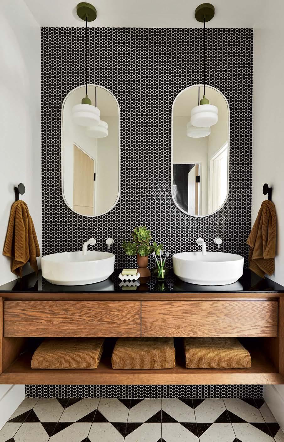 Right: A secondary bathroom features a black penny tile which contrasts with Icera sinks and white faucets by Phylrich. The vanity cabinet is a Soko Dai design realized by DLC Builders Inc. and the floor tile is Wow.
