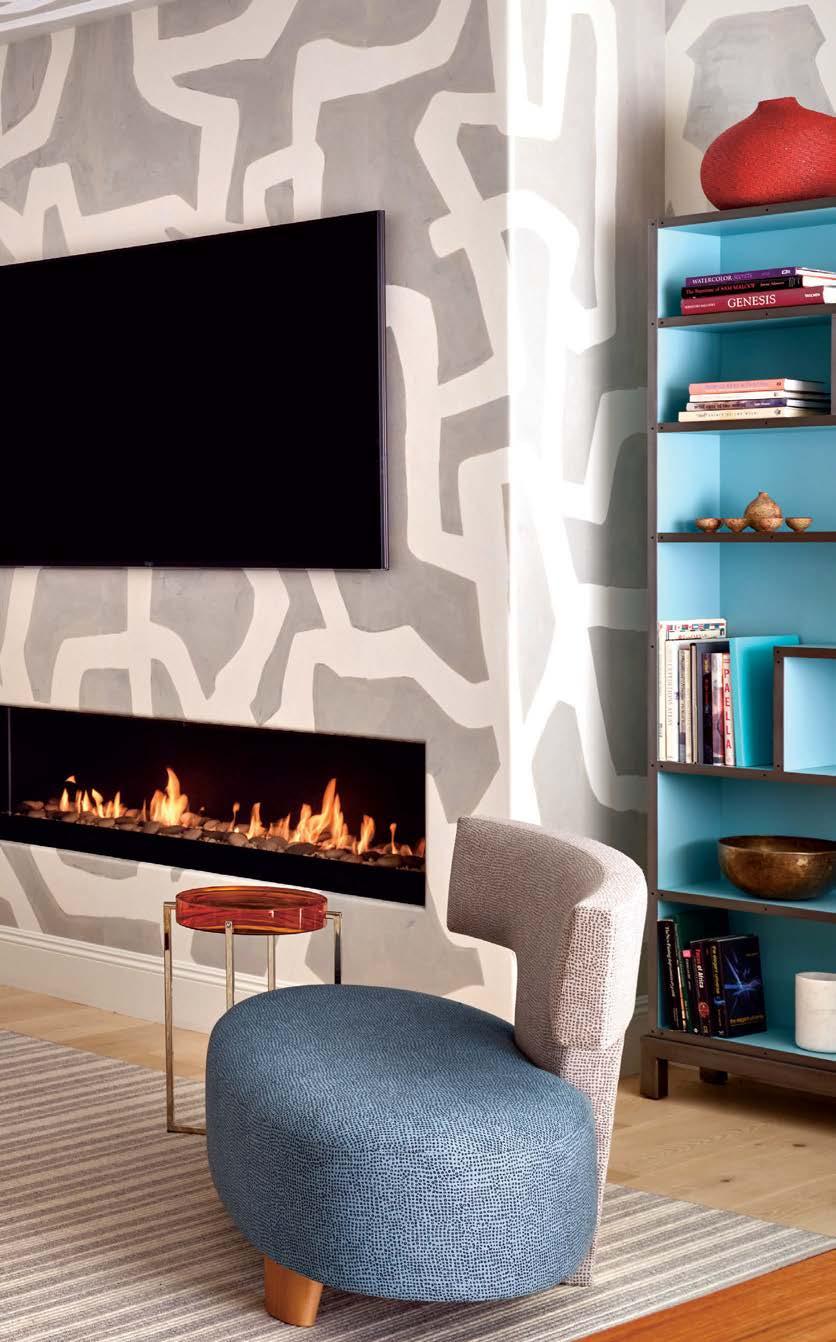 In the dining room, black wishbone chairs from HD Buttercup encircle a gray-lacquered pedestal table from Modloft above which hangs an Arteriors chandelier. The custom wine cabinet features a marble backsplash and ebonized-oak cabinets.