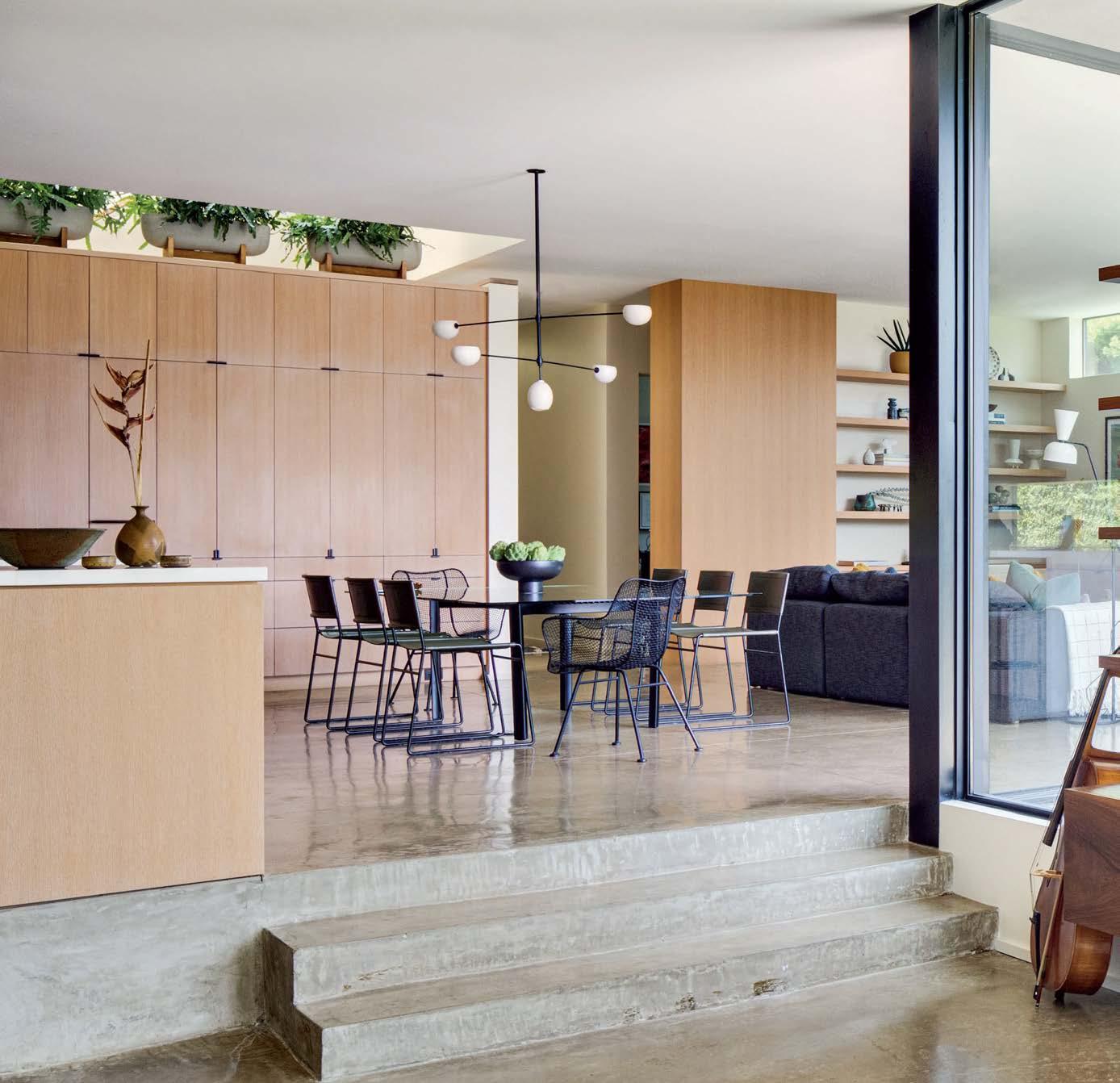 Opposite: Open to the living room and kitchen, the dining area features vintage Vico Magistretti Villabianca chairs for Cassina around a custom steel-and-glass table. The bespoke pendant is by Allied Maker.