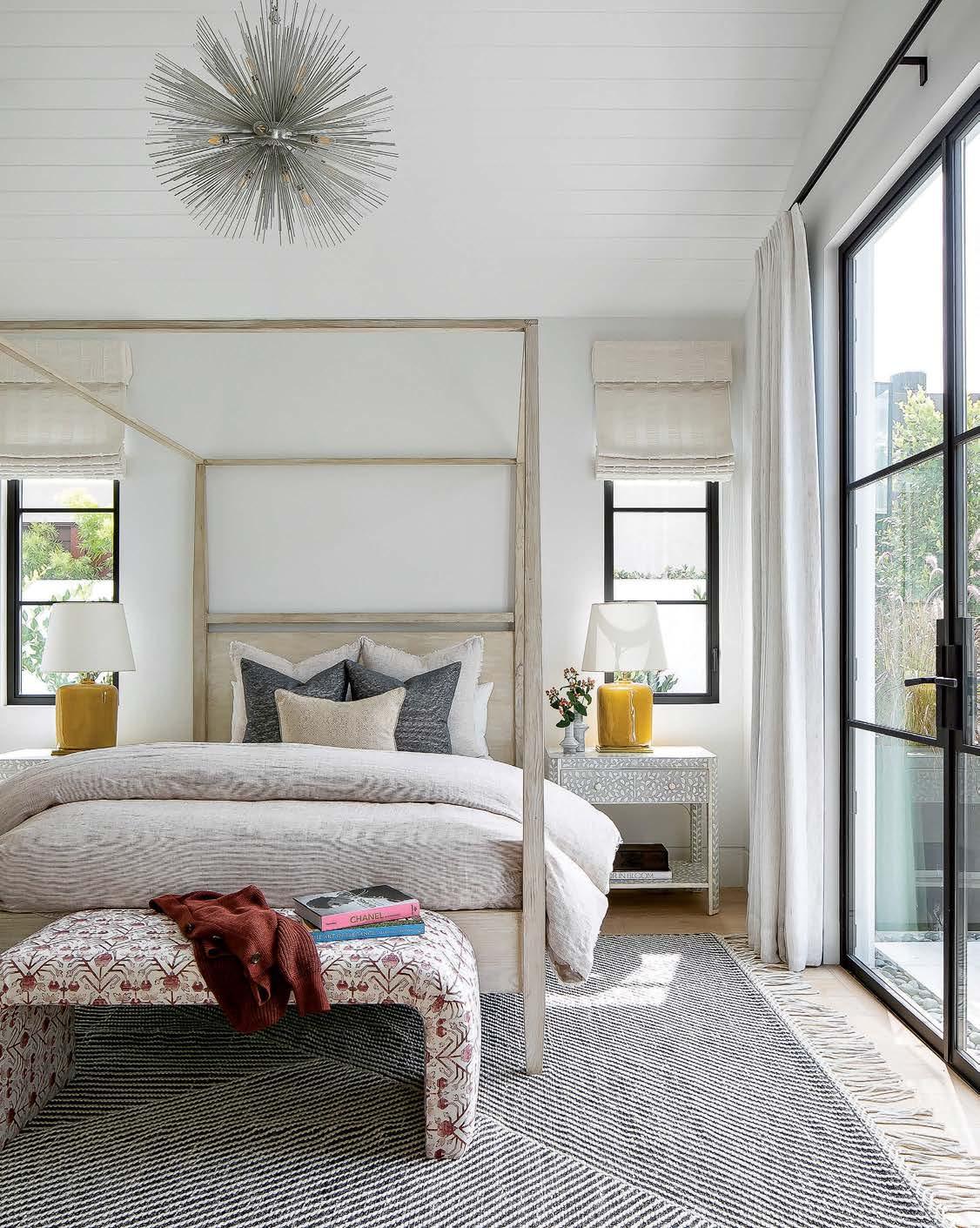 Oskar Zięta’s stainless-steel-mirror wall sculpture, Tafla 03, sounds a glamorous, organic note in the primary bedroom, where a custom Magni Home Collection bed and bench pair with a wool-and-silk rug from International Flooring. The ceramic sculpture is by Laura Knell.