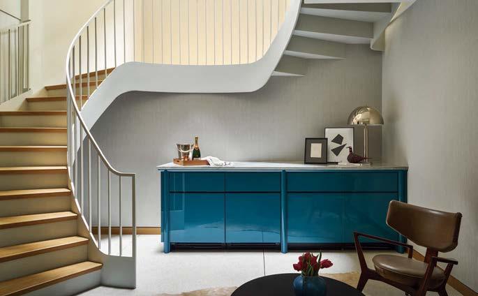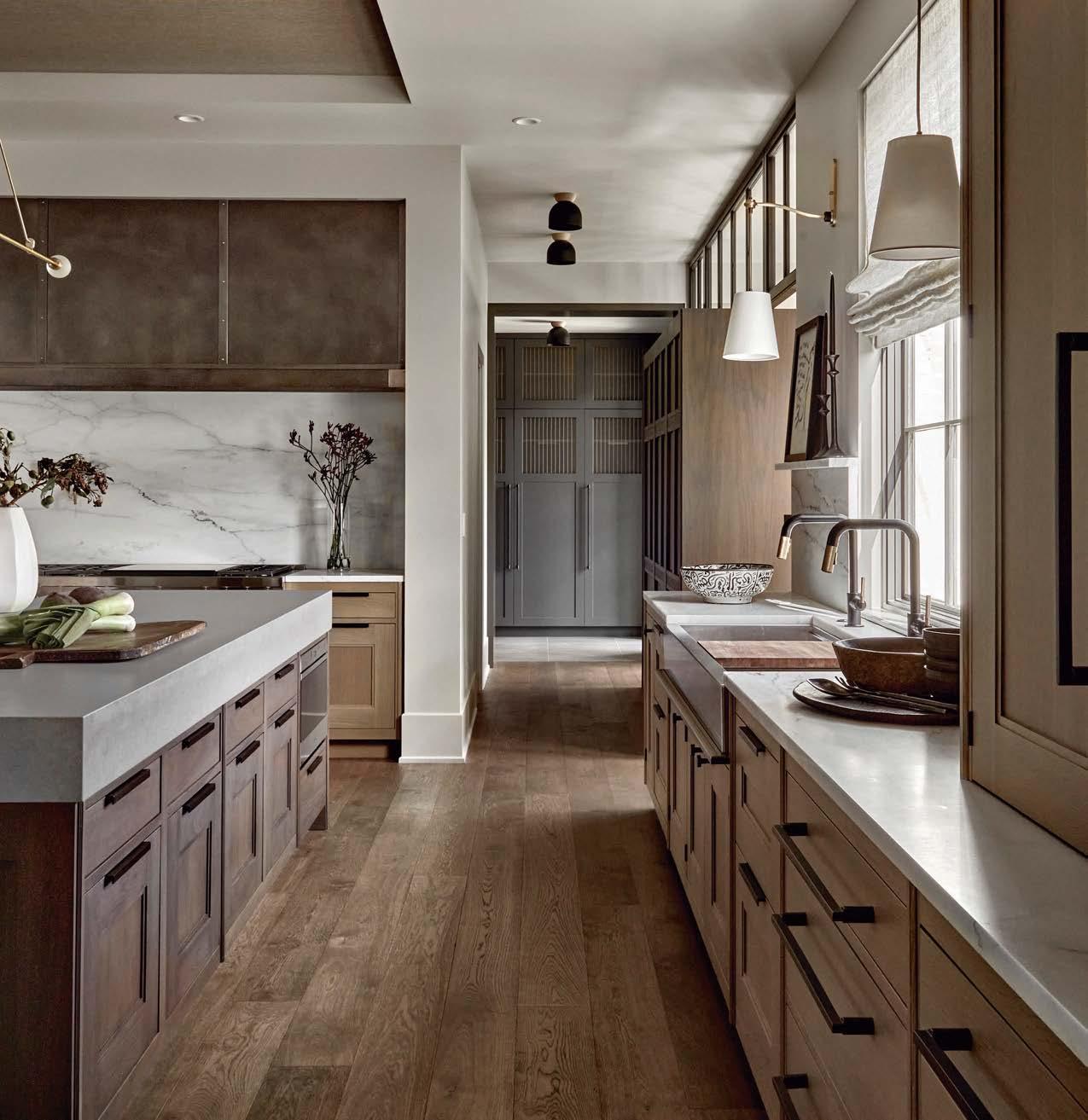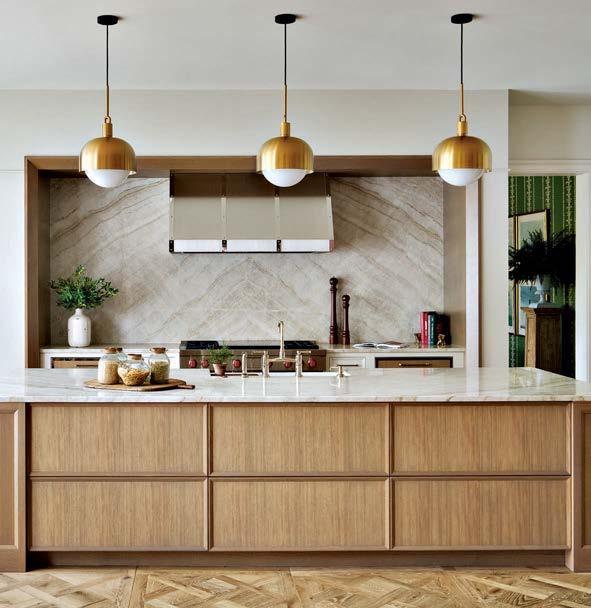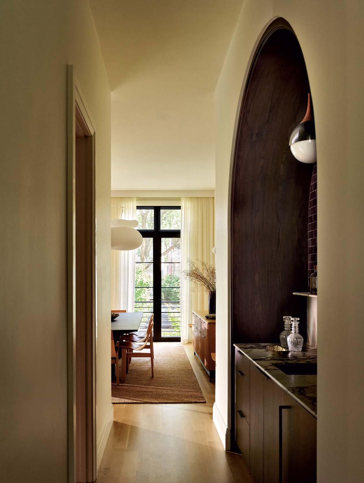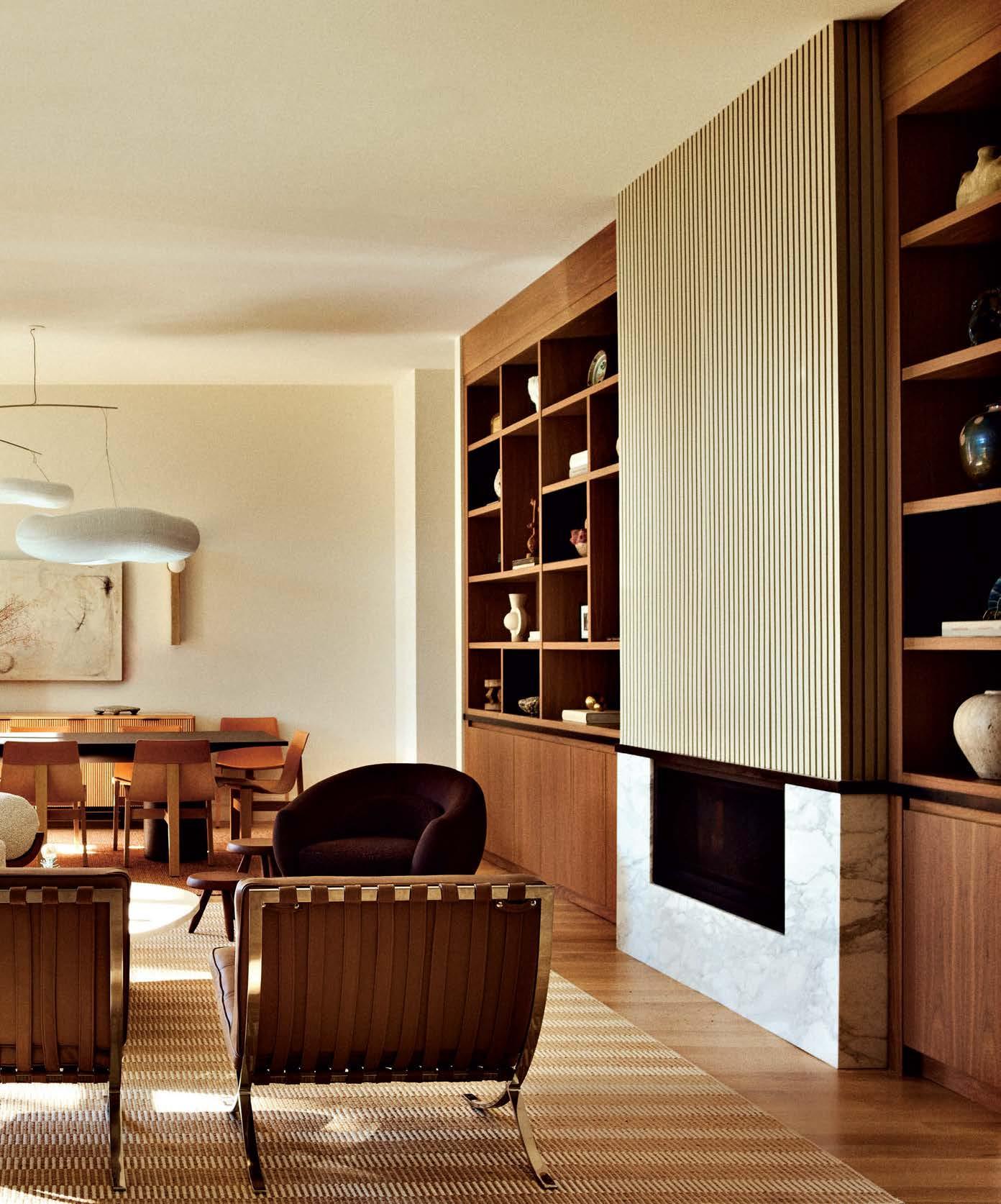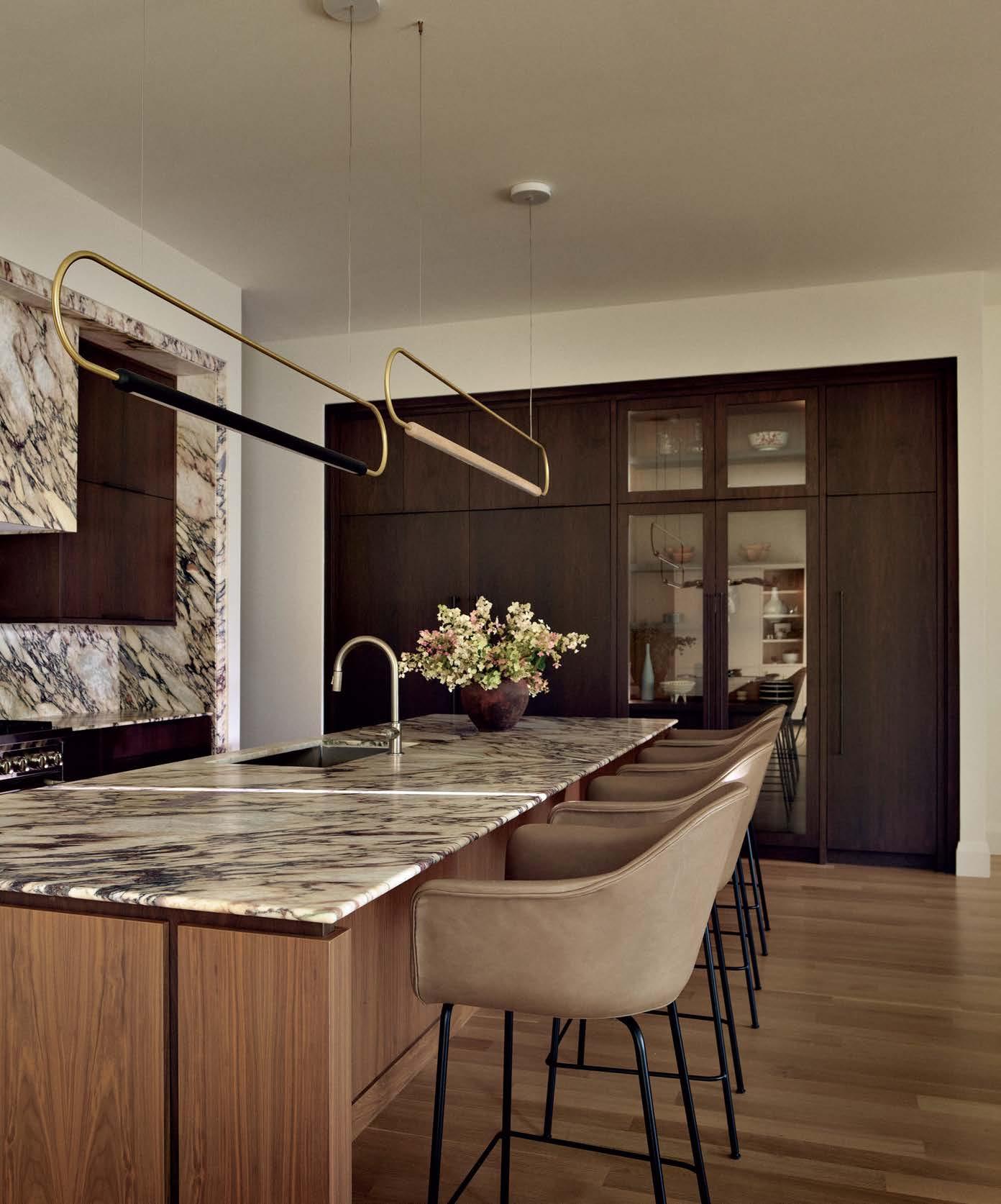 bibliophile household) and decorative fluted panels over the fireplace. In the kitchen, elements like the statement-making Calacatta Viola marble, glass-front display cabinets and an island detailed with walnut in a lighter shade than the perimeter cabinetry give the hardworking room a healthy dose of glamour. And, at the home’s core, long, capsule-shaped metal spindles along the staircase make for a passageway with a sculptural aspect.